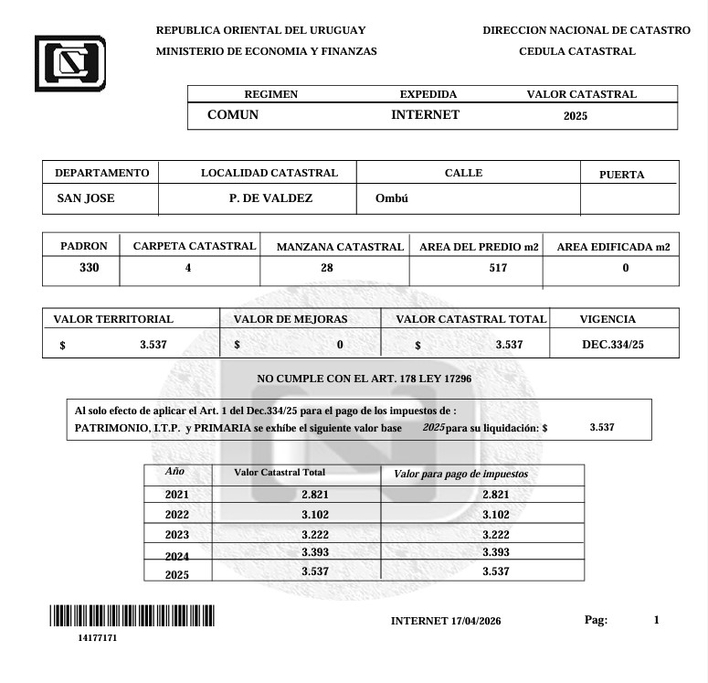 EDICTO: Por disposición del Sr/a. Juez Letrado de Libertad de 2º Turno, dictada en autos: “VIERA, VANESSA GERALDINE C/ CARBAJAL, OLGA DEMANDA LABORAL” IUE 530-947/2018, el día 22 de abril de 2026, a partir de la hora 14, en las puertas del Juzgado, calle 25 de Agosto Nº 1133 de la ciudad de Libertad, saldrá a la venta en subasta pública por intermedio del Martillero ASDRUBAL CABRERA, Matrícula 4938, Rut. 170084310011, asistido por la señora Alguacil, sin base y al mejor postor, el 50% del siguiente bien inmueble: un solar de terreno, sin construcciones, ubicado en Puntas de Valdez, paraje de la Sexta Sección Judicial del Departamento de San José, empadronado con el número 330 urbano (antes número 15.499 rural), señalado con el número cuatro de la manzana número veintiocho, en el plano del Agrimensor Leonel Mesa Páez, de julio de mil novecientos sesenta, inscripto en la Dirección General de Catastro, con el número mil cuatrocientos veintiocho, el día cinco de agosto del mismo año, con una superficie de quinientos dieciséis metros, setenta y nueve decímetros, que deslindan: Noreste, trece metros, diez centímetros, de frente a calle existente de diez metros; Suroeste, igual medida con el solar número tres; Noroeste, treinta y nueve metros cuarenta y cinco centímetros, con el solar número dos; y Sureste, igual medida con el solar número seis, todos del mismo plano.- SE PREVIENE: 1) Que el mejor postor deberá consignar en el acto del remate, en concepto de seña, el 50% del precio final así como la comisión del Rematador e IVA 3.66% debiendo cumplir con lo establecido en la ley 19.210, MODIFICATIVAS Y CONCORDANTES y decretos reglamentarios. 2) Que son de cuenta del adquirente los gastos de escritura, certificados e impuestos que la ley pone a su cargo. 3) Que el plazo para consignar el saldo, será de veinte días corridos contados a partir del día hábil siguiente al de la notificación del auto aprobatorio del remate, que no se interrumpirá por las ferias judiciales ni por semana de turismo. 4) Que será de cargo de la parte demandada (Expediente) la comisión de venta del Rematador e IVA 1.22% más el impuesto Ley 12.700 y gastos administrativos que genere su pago. 5) Que únicamente se autorizará a imputar como parte del precio lo necesario para escriturar hasta la fecha del remate (Contribución Inmobiliaria, Impuesto de Enseñanza Primaria, ITP e IRPF vendedor). 6) Que se desconoce el estado ocupacional del bien y su estado de conservación. 7) Que se conoce la existencia de deuda de contribución inmobiliaria y por la existencia de la misma la Intendencia de San José no emite certificado de afectaciones. 8) Que la sucesión de los propietarios del bien, entre los que se encuentra la deudora de autos no se encuentran tramitadas. 9) Que el remate del bien se efectúa en las condiciones que resultan del expediente, de la documentación agregada, de los certificados registrales y en las condiciones físicas y jurídicas que presente al día de la subasta y se vende en el estado material en que se encuentra sin derecho a reclamación de clase alguna, siendo de cargo del oferente tomar conocimiento de las mismas de modo previo a la diligencia, debiéndose tener presente lo dispuesto en el art. 390 inc. final del C. G. P. 10) Que la documentación se encuentra a disposición de los interesados en la Sede del Juzgado, calle 25 de Agosto Nº 1133 de la ciudad de Libertad. Y a los efectos legales se hace constar esta publicación. Libertad, 09 de marzo de 2026. -ROSSINA RODRIGUEZ ELHORDOY, Actuario Adjunto.