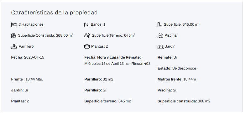 EDICTO: Por disposición del Sr/a. Juez Letrado Civil de 3º Turno, dictada en autos: “POGGIO HELGUERA, FERNANDO NICOLAS Y OTROS C/ HERNANDEZ MARTINEZ ANA LAURA Y OTRO – EJECUCION HIPOTECARIA” IUE 2- 15615/2023, se hace saber que el próximo 15 de abril a las 13 horas en el local de la calle Rincón 408, por intermedio de los martilleros DANTE Y/O GUSTAVO IOCCO, Matrículas Nos 6970 y 1716, RUT 211808550010, asistidos del Oficial Alguacil del Juzgado se procederá al remate público, sin base, en dólares estadounidenses y al mejor postor del siguiente bien inmueble: solar de terreno con construcciones y demás mejoras que le acceden, ubicado en la Localidad Catastral de Maldonado, del Departamento Maldonado, zona urbana, antes 1ª sección judicial, manzana catastral según cedula catastral Nº 1028, empadronado actualmente con el Nº 10.396 (antes padrón 10.396 y parte del padrón 10.397) señalado como solar 1 en el plano de mensura y reparcelamiento del Ing. Hebel Barrios de diciembre de 1992, inscripto en la Oficina Departamental de Catastro de Maldonado con el Nº 3387 el 22/3/1993, según el cual consta de una superficie 645 m2 40 dmts. y deslinda así: 18 mts. 44cmts. al SO de frente a calle San Martin, distando el extremo más próximo de su frente 17 mts. 57 cmts. de la esquina formada por la intersección de la arteria mencionada con calle 17 mst., 35 mts al NO lindando con padrón Nº 3845; 18 mts. 44 cmts. al NE lindando con parte del padrón Nº 3846 y 35 mts. al SE lindando con solar Nº 2 (actual padrón 10397) del mismo plano. SE PREVIENE: 1°) Que el mejor postor deberá consignar como seña, en efectivo o letra de cambio y en dólares estadounidenses el 30 % de su oferta al bajarse el martillo y que la misma se deberá consignar por cualquiera de los medios de pago previstos por la Ley de Inclusión Financiera, modificativas y decretos reglamentarios. 2°) Que serán de cargo del Comprador los gastos de escrituración, honorarios, certificados y la Comisión de Compra del Rematador e IVA, o sea el 3,66% del precio de remate. 3°) Que será de cargo del Demandado la Comisión de Venta del Rematador e IVA, o sea el 1,22 % del precio de remate. 4°) El bien inmueble se encuentra ocupado. 5º) Que se desconoce la existencia de deudas de construcción ante el BPS e Intendencia de Maldonado. 6º) Que existe deuda de Contribución Inmobiliaria y de Impuesto de Enseñanza Primaria. 7º) Que podrá descontarse del saldo de precio, lo que se adeudare por concepto de Contribución Inmobiliaria e Impuesto de Primaria a la fecha de la subasta y que el plazo para consignar el saldo de precio por el mejor postor será de 20 días corridos a partir del día siguiente a la notificación del auto aprobatorio del remate, que no se interrumpirá por las ferias ni por semana de turismo. Todo otro gasto que se pretenda imputar debe contar con expresa autorización de la Sra Juez. 8º) Quien resulte mejor postor en el remate deberá tramitar previamente a la escrituración del bien ante la I.M de Maldonado el certificado referente al derecho de preferencia previsto por el art.66 de la ley 18.308 conforme lo que surge dispuesto en autos. 9º) Se desconoce la situación ante OSE sin perjuicio de lo que surge a fs 90 del expediente y surge de fs 140 el plano agregado no tiene validez de copia fiel. 10º) Que la subasta se realiza en las condiciones que surgen del expediente, documentación registral y documentación agregada, la que se encuentra a disposición de los interesados en la Sede, Pasaje de los Derechos Humanos 1309 piso 3º. Y a los efectos legales se hacen estas publicaciones. Montevideo, 18 de marzo de 2026 – MARÍA JOSÉ MORENO ARAÚJO, Actuario Adjunto
