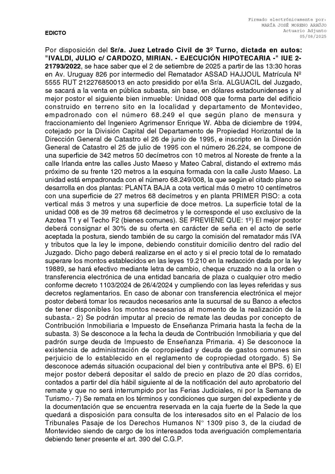 EDICTO: Por disposición del Sr/a. Juez Letrado Civil de 3º Turno, dictada en autos: “IVALDI, JULIO c/ CARDOZO, MIRIAN. – EJECUCIÓN HIPOTECARIA -” IUE 2-21793/2022, se hace saber que el 2 de setiembre de 2025 a partir de las 13:30 horas en Av. Uruguay 826 por intermedio del Rematador ASSAD HAJJOUL Matrícula Nº 5555 RUT 212276850013 en acto presidido por el/la Sr/a. ALGUACIL del Juzgado, se sacará a la venta en pública subasta, sin base, en dólares estadounidenses y al mejor postor el siguiente bien inmueble: Unidad 008 que forma parte del edificio construido en terreno sito en la localidad y departamento de Montevideo, empadronado con el número 68.249 el que según plano de mensura y fraccionamiento del Ingeniero Agrimensor Enrique W. Abba de diciembre de 1994, cotejado por la División Capital del Departamento de Propiedad Horizontal de la Dirección General de Catastro el 26 de junio de 1995, e inscripto en la Dirección General de Catastro el 25 de julio de 1995 con el número 26.224, se compone de una superficie de 342 metros 50 decímetros con 10 metros al Noreste de frente a la calle Irlanda entre las calles Justo Maeso y Mateo Cabral, distando el extremo más próximo de su frente 120 metros a la esquina formada con la calle Justo Maeso. La unidad está empadronada con el número 68.249/008, la que según el citado plano se desarrolla en dos plantas: PLANTA BAJA a cota vertical más 0 metro 10 centímetros con una superficie de 27 metros 68 decímetros y en planta PRIMER PISO: a cota vertical más 3 metros y una superficie de doce metros. La superficie total de la unidad 008 es de 39 metros 68 decímetros y le corresponde el uso exclusivo de la Azotea T1 y el Techo F2 (bienes comunes). SE PREVIENE QUE: 1º) El mejor postor deberá consignar el 30% de su oferta en carácter de seña en el acto de serle aceptada la postura, siendo también de su cargo la comisión del rematador más IVA y tributos que la ley le impone, debiendo constituir domicilio dentro del radio del Juzgado. Dicho pago deberá realizarse en el acto y si el precio total de lo rematado superare los montos establecidos en las leyes 19.210 en la redacción dada por la ley 19889, se hará efectivo mediante letra de cambio, cheque cruzado no a la orden o transferencia electrónica de una entidad bancaria de plaza o cualquier otro medio conforme decreto 1103/2024 de 26/4/2024 y cumpliendo con las leyes referidas y sus decretos reglamentarios. En caso de abonar con transferencia electrónica el mejor postor deberá tomar los recaudos necesarios ante la sucursal de su Banco a efectos de tener disponibles los montos necesarios al momento de la realización de la subasta.- 2) Se podrán imputar al precio de remate las deudas por concepto de Contribución Inmobiliaria e Impuesto de Enseñanza Primaria hasta la fecha de la subasta. 3) Se desconoce a la fecha la deuda de Contribución Inmobiliaria y que del padrón surge deuda de Impuesto de Enseñanza Primaria. 4) Se desconoce la existencia de administración de copropiedad y deuda de gastos comunes sin perjuicio de lo establecido en el reglamento de copropiedad otorgado. 5) Se desconoce además situación ocupacional del bien y contributiva ante el BPS. 6) El mejor postor deberá depositar el saldo de precio en plazo de 20 días corridos, contados a partir del día hábil siguiente al de la notificación del auto aprobatorio del remate y que no será interrumpido por las Ferias Judiciales, ni por la Semana de Turismo.- 7) Se remata en los términos y condiciones que surgen del expediente y de la documentación que se encuentra reservada en la caja fuerte de la Sede la que quedará a disposición para consulta de los interesados sito en el Palacio de los Tribunales Pasaje de los Derechos Humanos Nº 1309 piso 3, de la ciudad de Montevideo siendo de cargo de los interesados toda averiguación complementaria debiendo tener presente el art. 390 del C.G.P. Montevideo, 05 de agosto de 2025. -MARÍA JOSÉ MORENO ARAÚJO, Actuario Adjunto