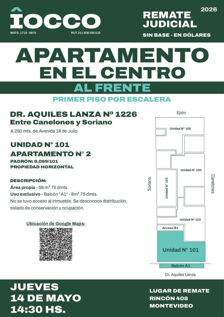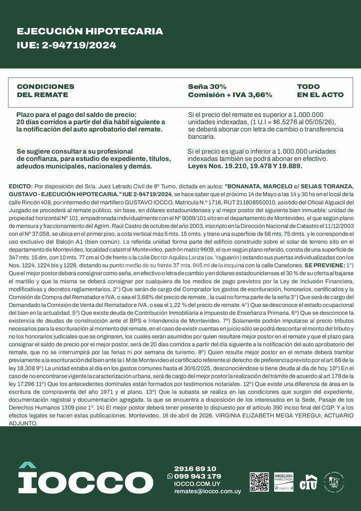 EDICTO: Por disposición del Sr/a. Juez Letrado Civil de 8º Turno, dictada en autos: “BONANATA, MARCELO c/ SEIJAS TORANZA, GUSTAVO – EJECUCIÓN HIPOTECARIA.” IUE 2-94719/2024, EDICTO.- Por disposición del Señor Letrado de Primera Instancia en lo Civil de 8º Turno dictada en autos caratulados “ BONANATA, MARCELO C/ SEIJAS TORANZA, GUSTAVO – EJECUCION HIPOTECARIA –IUE: 2-94719/2024 se hace saber que el próximo 14 de Mayo a las 14 y 30 hs en el local de la calle Rincón 408, por intermedio del martillero GUSTAVO IOCCO, Matrícula N.º 1716, RUT 211808550010, asistido del Oficial Alguacil del Juzgado se procederá al remate público, sin base, en dólares estadounidenses y al mejor postor del siguiente bien inmueble: unidad de propiedad horizontal Nº 101, empadronada individualmente con el Nº 9069/101 sito en el departamento de Montevideo, el que según plano de mensura y fraccionamiento del Agrim. Raúl Castro de octubre del año 2003, inscripto en la Dirección Nacional de Catastro el 11/12/2003 con el Nº 37.058, se ubica en el primer piso, a cota vertical más 5 mts. 15 cmts. y tiene una superficie de 58 mts. 75 dmts. y le corresponde el uso exclusivo del Balcón A1 (bien común). La referida unidad forma parte del edificio construido sobre el solar de terreno sito en el departamento de Montevideo, localidad catastral Montevideo, padrón matriz 9609, el que según plano referido, consta de una superficie de 347 mts. 15 dm, con 10 mts. 77 cm al O de frente a la calle Doctor Aquiles Lanza (ex. Yaguarón) estando sus puertas individualizadas con los Nos. 1224, 1224 bis y 1226, distando su punto medio de su frente 37 mts. 945 ml de la esquina con la calle Canelones. SE PREVIENE: 1°) Que el mejor postor deberá consignar como seña, en efectivo o letra de cambio y en dólares estadounidenses el 30 % de su oferta al bajarse el martillo y que la misma se deberá consignar por cualquiera de los medios de pago previstos por la Ley de Inclusión Financiera, modificativas y decretos reglamentarios. 2°) Que serán de cargo del Comprador los gastos de escrituración, honorarios, certificados y la Comisión de Compra del Rematador e IVA, o sea el 3,66% del precio de remate., la cual no forma parte de la seña 3°) Que será de cargo del Demandado la Comisión de Venta del Rematador e IVA, o sea el 1,22 % del precio de remate. 4°) Que se desconoce el estado ocupacional del bien en la actualidad. 5º) Que existe deuda de Contribución Inmobiliaria e Impuesto de Enseñanza Primaria. 6º) Que se desconoce la existencia de deudas de construcción ante el BPS e Intendencia de Montevideo. 7º) Solamente podrán imputarse al precio tributos necesarios para la escrituración al momento del remate, en el caso de existir cuentas en juicio sólo se podrá descontar el monto del tributo y no los honorarios judiciales que se originaren, los cuales serán asumidos por quien resultare mejor postor en el remate y que el plazo para consignar el saldo de precio por el mejor postor, será de 20 días corridos a partir del día siguiente a la notificación del auto aprobatorio del remate, que no se interrumpirá por las ferias ni por semana de turismo. 8º) Quien resulte mejor postor en el remate deberá tramitar previamente a la escrituración del bien ante la I.M de Montevideo el certificado referente al derecho de preferencia previsto por el art.66 de la ley 18.308 9º) La unidad estaba al día en los gastos comunes hasta el 30/6/2025, desconociéndose si tiene deuda al día de hoy. 10º) En el caso de no encontrarse vigente la caracterización urbana, será de cargo del mejor postor la realización del trámite de acuerdo al art.178 de la ley 17.296 11º) Que los antecedentes domínales están formados por testimonios notariales. 12º) Que existe una diferencia de área en la escritura de compraventa del año 1971 y el plano. 13º) Que la subasta se realiza en las condiciones que surgen del expediente, documentación registral y documentación agregada, la que se encuentra a disposición de los interesados en la Sede, Pasaje de los Derechos Humanos 1309 piso 1º. 14) El mejor postor deberá tener presente lo dispuesto por el artículo 390 inciso final del CGP. Y a los efectos legales se hacen estas publicaciones. Montevideo, 16 de abril de 2026 – VIRGINIA ELIZABETH MEGA YEREGUI, Actuario Adjunto