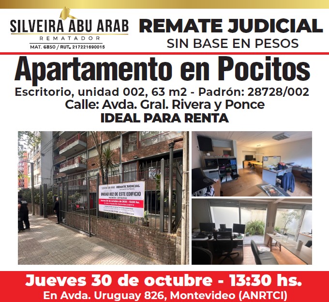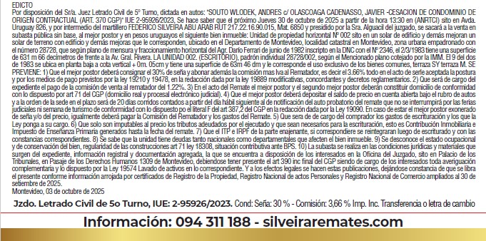 EDICTO: Por disposición del Sr/a. Juez Letrado Civil de 5º Turno, dictada en autos: “SOUTO WLODEK, ANDRES c/ OLASCOAGA CADENASSO, JAVIER – CESACION DE CONDOMINIO DE ORIGEN CONTRACTUAL (ART. 370 CGP)” IUE 2-95926/2023, Se hace saber que el próximo Jueves 30 de octubre de 2025 a partir de la hora 13:30 en (ANRTCI) sito en Avda. Uruguay 826, y por intermedio del martillero FEDERICO SILVEIRA ABU ARAB RUT 217.22.16.90.015, Mat. 6850 y presidido por la Sra. Alguacil del juzgado, se sacará a la venta en subasta pública sin base, al mejor postor y en pesos uruguayos el siguiente bien inmueble: Unidad de propiedad horizontal Nº 002 sito en un solar de edificio y demás mejoran un solar de terreno con edificio y demás mejoras que le corresponden, ubicado en el Departamento de Montevideo, localidad catastral en Montevideo, zona urbana empadronado con el número 28728, que según plano de mensura y fraccionamiento horizontal del Agr. Darío Ferrari de junio de 1982 inscripto en la DNC con el Nº 2346, el 2/3/1983 tiene una superficie de 631 m 66 decímetros de frente a la Av. Gral. Rivera. LA UNIDAD 002. (ESCRITORIO), padrón individual 28728/002, según el Mencionado plano cotejado por la IMM. El 9 del dos de 1983 se ubica en planta baja a cota vertical + 0m. 05cm y tiene una superficie de 63m 46 dm y le corresponde el uso exclusivo de los bienes comunes, terraza SY terraza M. SE PREVIENE: 1) Que el mejor postor deberá consignar el 30% de seña y abonar además la comisión más Iva al Rematador, es decir el 3.66% todo en el acto de serle aceptada la postura y por los medios de pago previstos por la ley 19210 y 19478, en la redacción dada por la ley 19889 modificativas, concordantes y decretos reglamentarios. 2) Que será de cargo del expediente el pago de la comisión de venta al rematador del 1.22%. 3) En el acto del Remate el mejor postor y el segundo mejor postor deberán constituir domicilio de conformidad con lo dispuesto por art 71 del CGP (domicilio real y procesal electrónico judicial). 4) Que el mejor postor deberá depositar el saldo de precio en cuenta abierta bajo el rubro de autos y a la orden de la sede en el plazo será de 20 días corridos contados a partir del día hábil siguiente al de notificación del auto probatorio del remate que no se interrumpirá por las ferias judiciales ni semana de turismo de conformidad con lo dispuesto por el literal F del art 387,2 del CGP en la redacción dada por la Ley 19090. En caso de estar el mejor postor exonerado de seña y/o del precio, igualmente deberá pagar la Comisión del Rematador y los gastos del Remate. 5) Que será de cargo del comprador los gastos de escrituración y los que la Ley ponga a su cargo. 6) Que solo son imputables al precio los tributos adeudados por el ejecutado y que sean necesarios para la escrituración, esto es Contribución Inmobiliaria e Impuesto de Enseñanza Primaria generados hasta la fecha del remate. 7) Que el ITP e IRPF de la parte enajenante, si correspondiere se reintegraran luego de escriturado y con las constancias correspondientes. 8) Se sabe que la unidad tiene deudas tanto nacionales como departamentales que afecten el bien inmueble. 9) Se desconoce el estado ocupacional y de conservación del bien, regularidad de las construcciones art 71 ley 18308, situación contributiva ante BPS. 10) La subasta se realiza en las condiciones jurídicas y materiales que surgen del expediente, información registral y documentación agregada, la que se encuentra a disposición de los interesados en la Oficina del Juzgado, sito en Palacio de los Tribunales, en Pasaje de los Derechos Humanos 1309 de Montevideo, debiéndose tener presente el art 390 inc final del CGP siendo de cargo de los interesados toda averiguación complementaria y lo dispuesto por la Ley 19574 Lavado de activos en lo correspondiente. Y a los efectos legales se hacen estas publicaciones, dejándose constancia de que se libra el presente conforme información arrojada por certificados de Registro de la Propiedad, Registro Nacional de actos Personales y Registro Nacional de Comercio ampliados al 30 de setiembre de 2025. Montevideo, 03 de octubre de 2025 – ALEXANDRA SABRINA MACHADO RUSU, Actuario Adjunto
