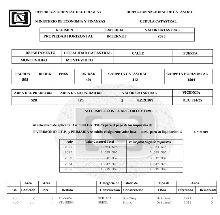 EDICTO: Por disposición del Sr/a. Juez de Paz Departamental Capital de 22º Turno, dictada en autos: “EDIFICIO PRIMERA AVENIDA c/ CUADRO MUSLERA, NOELIA – EJECUCIÓN DE HIPOTECA” IUE 2- 64145/2020, se hace saber que el próximo miércoles 06 de mayo de 2026 a las 13:30 horas en el local de la Avenida Uruguay 826, por intermedio del Martillero Pablo Lakierovich, Matrícula Nº 5780, RUT 215178070018, en acto presidido por la Sra. Alguacil de la Sede se procederá a la venta en pública subasta, sin base, al mejor postor y en moneda nacional del siguiente bien inmueble: Unidad de propiedad horizontal número 401 que forma parte del edificio construido de acuerdo a la ley 10.751 modificativas y concordantes y a los permisos de construcción números 117.962, 109.143 y 113.842 con habilitación municipal del 14 de octubre de 1971, en un solar de terreno sito en la séptima Sección Judicial de Montevideo, Localidad Catastral Montevideo, padrón número 805, el que según plano del mensura y fraccionamiento horizontal del Ingeniero Agrimensor Walter J. Rodríguez, de noviembre de 1970, cotejado por la Dirección de Edificación del Municipio de Montevideo el día 3 de noviembre de 1971 e inscripto en la Dirección General de Catastro el 17 de noviembre siguiente con el Nº 67.531, tiene una superficie de 528 metros 99 decímetros, con 29 metros 15 centímetros de frente al Noreste a la calle Vázquez y 18 metros 15 centímetros de frente al Sureste a la Avenida 18 de Julio por ser esquina. La unidad 401 está empadronada individualmente con el número 805/401, se ubica en el cuarto piso a cota vertical más 15 metros 30 centímetros y tiene una superficie de 124 metros 70 decímetros. Le corresponde el uso exclusivo de la terraza “M4” (bien común).- SE PREVIENE: 1º) Que conforme al artículo 386 del CGP, el remate se realizará sin base y al mejor postor, sin perjuicio de la facultad del martillero de suspenderlo por precio incompetente o manifiestamente inadecuado y sin que pueda reclamarse por quien hubiera hecho postura, la cual quedará sin efecto. 2º) Que el mejor postor deberá consignar el 30% de su oferta en carácter de seña en el acto de serle aceptada la postura, así como la Comisión del Rematador, o sea el 3,66% del precio del remate más IVA. Dicho pago deberá realizarse en el acto, el que deberá consignarse por cualquiera de los medios de pago previstos por la Ley 19210, modificativas y sus decretos reglamentarios. 3º) Que el plazo para consignar el saldo de precio es de 20 días corridos contados a partir del día hábil siguiente al de la notificación del auto aprobatorio del remate, que no se interrumpirá ni por las ferias judiciales ni por la semana de turismo. La cancelación deberá realizarse y documentarse de acuerdo a la Ley 19.210, modificativas y decretos reglamentarios. 4º) Que los gastos de escrituración, honorarios, certificados, impuestos y todos aquellos que la Ley pone a su cargo, serán asumidos por el adquirente. 5º) Que será de cargo del expediente la Comisión de Venta del Rematador más IVA que totaliza el 1,22% sobre el precio de remate, así como los gastos de remate. 6º) Que se desconoce la regularidad de las construcciones existentes en el inmueble, así como el estado de conservación, la situación ocupacional del mismo y la situación contributiva ante el BPS por aportes a la construcción y la IMM. 7º) Que existe deuda de Contribución Inmobiliaria, Tasa General Municipal, Impuesto de Enseñanza Primaria y por gastos comunes, desconociendo la existencia de otros. 8º) Que solamente podrán ser imputados al precio las deudas por Contribución Inmobiliaria e Impuesto de Enseñanza Primaria, hasta la fecha de remate; el ITP de la parte vendedora y el IRPF en caso de corresponder, serán reintegrados al mejor postor luego de la escrituración, siempre que exista saldo suficiente. En caso de existir cuentas en juicio sólo se podrá descontar el monto del tributo y no los honorarios profesionales que se originaren, los que serán de cargo del mejor postor. 9º) Que quien resulte mejor postor en el remate deberá tramitar previamente a la escrituración del bien ante la Intendencia correspondiente, el certificado referente al derecho de preferencia previsto por el artículo 66 de la Ley 18.308. 10º) Que el inmueble no cumple con el art. 178 de la Ley 17.296 (Declaración Jurada de Caracterización Urbana). 11º) Que el inmueble se remata en las condiciones jurídicas y materiales que surgen del expediente, los certificados registrales y la documentación presentada. 12º) Que el estudio de la documentación se ha realizado en base al último título de acuerdo con el testimonio de la matriz inscripto conforme al art 384.2 del CGP, el que se encuentra a disposición de los interesados en la Sede de OFGECEN sito en 25 de Mayo Nº 500 de ésta ciudad (art. 387 a 390 CGP). Y a los efectos legales se hacen estas publicaciones, dejando constancia que se tuvieron a la vista certificados registrales Nº 3600116 de fecha 17/03/2026, 3600118 de fecha 13/03/2026 y 3185649 ampliado al 16/03/2026. Montevideo, 06 de abril de 2026. -FLORENCIA NATHALIE MONTERO ARABI, Administrativo III Colaboración Cargo: Actuario Adjunto.