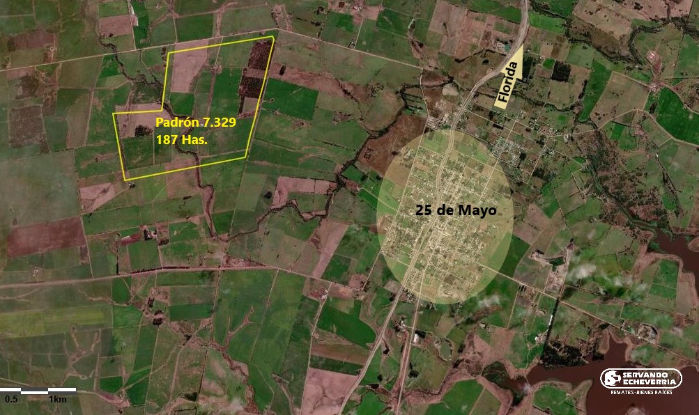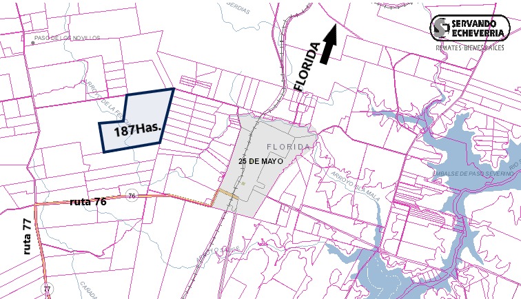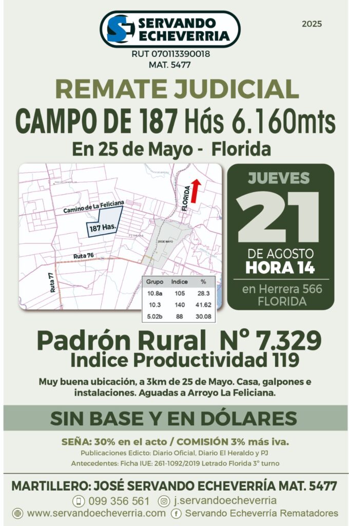 EDICTO: Por disposición del Sr/a. Juez Letrado de Florida de 3° Turno, dictada en autos: “BANCO DE LA REPUBLICA ORIENTAL DEL URUGUAY C/ MARTINEZ PONS, GUSTAVO EDUARDO; MARTINEZ BARCELO, GUSTAVO GREGORIO Y PONS MALAN, EDDY. EJECUCION HIPOTECARIA” IUE 261-1092/2019, se hace saber que el día jueves 21 de Agosto de 2025, a las 14 horas, en el local sito en la calle Luis A. de Herrera 566, el martillero José Servando Echeverría, matrícula 5477, RUT 070113390018, en diligencia que presidirá la Sra. Alguacil, procederá a la venta en subasta pública, sin base, al mejor postor, en dólares americanos del siguiente bien inmueble: fracción de campo y demás mejoras que le acceden sito en zona rural de la 8º Sección Catastral (antes 12 Sección Judicial) del Departamento de Florida, empadronada con el 7.329 (antes padrones anteriores 192 y 7329), la cual se señala como fracción Nº 2 en el plano del Agrim. Diego Raúl Aldama de agosto de 1946, inscripto en la Oficina Departamental de Catastro de Florida con el Nº 182 el 27 de agosto de 1946, según el cual consta de una superficie de 187 Hectáreas 6.160mts 94 dm, y se deslinda así: al Norte, 1.179mts de frente a Camino Vecinal; al Sureste 981mts 80cm con Sucesión Cartoni; al Sur 1.421mts 70cm con Alberto Gallo; y al Oeste 3 rectas de 741mts 70cm, 613mts 20cm, 656mts 20cm con fracción 1 del mismo plano.- SE PREVIENE: I) Que el mejor postor deberá consignar en el acto y por concepto de seña el 30% de su oferta en dólares americanos y en efectivo, pero si el precio total de lo rematado superare el 1.000.000 de unidades indexadas, el pago se hará con cualquiera de los medios de pago establecidos por la Ley de Inclusión Financiera, letra de cambio, cheque certificado o transferencia electrónica de una entidad bancaria de plaza cumpliendo así con la Ley 19.210 y 19.478 decretos reglamentarios, sus modificativas y en especial lo estipulado por la Ley 19.889 (LUC); II) Que se deberá integrar el saldo de precio en un plazo de 20 días corridos contados a partir del día hábil siguiente al de la notificación del auto aprobatorio del remate que no se interrumpirá ni por ferias judiciales ni semana de turismo; III) Que serán de cargo del comprador los gastos de escrituración, honorarios, impuestos, certificados, tasas municipales, la comisión de compra del Rematador más IVA (3,66%), y demás impuestos y gastos que la ley ponga a su cargo; IV) Que serán de cargo del demandado la comisión de venta del Rematador más IVA (1,22%) e impuesto municipal (1%) del precio de remate y demás impuestos que la ley ponga a su cargo; V) Que se desconoce la situación ocupacional de los bienes así como la existencia de deudas de construcción ante el BPS u organismos públicos; VI) Que existe deuda de contribución inmobiliaria; VII) Que solo podrán descontarse del saldo de precio de los tributos necesarios para la escrituración: impuesto de contribución inmobiliaria y enseñanza primaria adeudados hasta el día de la subasta; VIII) Que se remata el padrón en las condiciones materiales y jurídicas en que se encuentra según surgen del expediente, de los certificados registrales y de la documentación agregada la cual está a disposición de los interesados en la Oficina de esta Sede sito en la calle Independencia Nº 800 de la Ciudad de Florida, quedando a cargo de los interesados toda averiguación complementaria. (Art. 390 inciso final del C.G.P. Florida, 07 de agosto de 2025 CLAUDIA ALEJANDRA FERNÁNDEZ ECHEVERRY, Actuario Adjunto