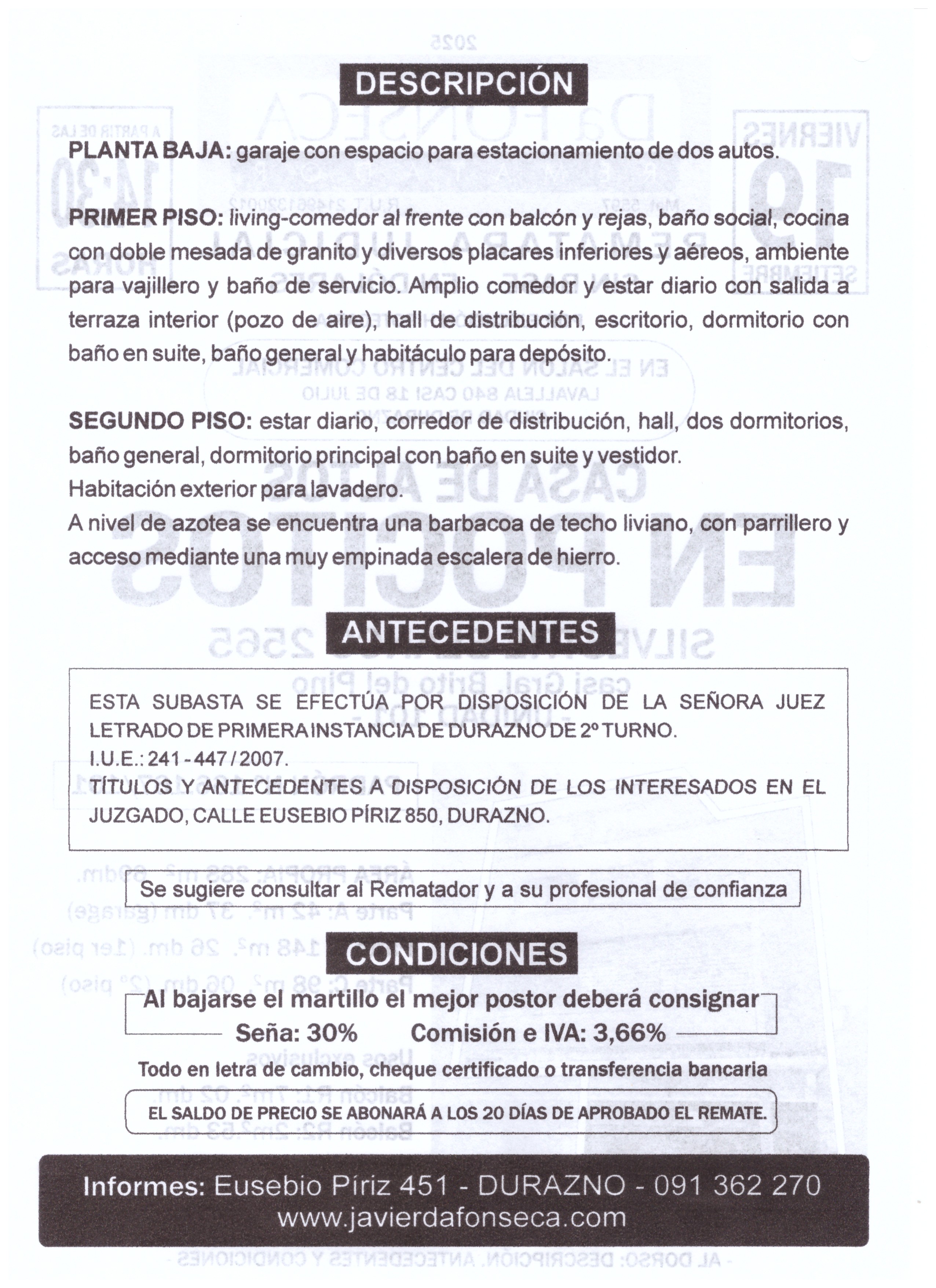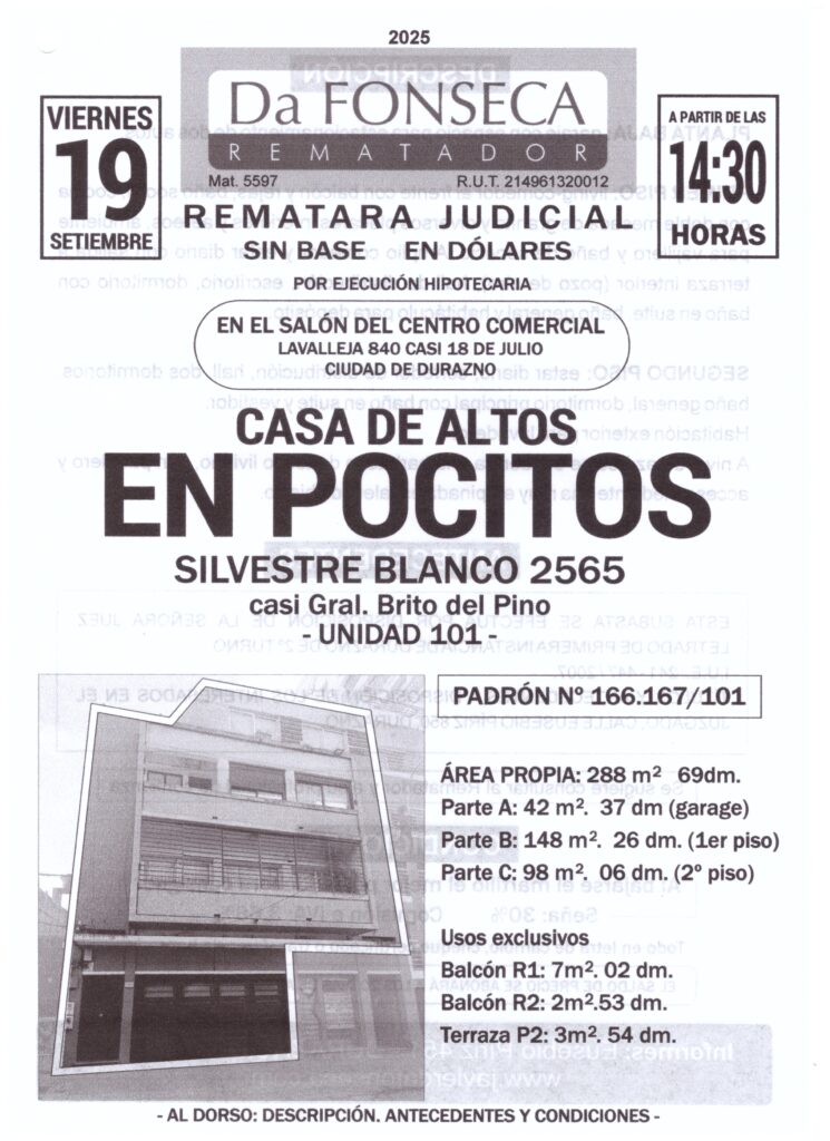 EDICTO: Por disposición del Sr/a. Juez Letrado de Durazno de 2° Turno, dictada en autos: “URGAL ROBERTO C/FERNANDEZ BOUZADA LUCIA DEL CARMEN. EJECUCION DE HIPOTECA.-” IUE 241-447/2007, se hace saber que el próximo 19 de Setiembre a las 14.30 horas en el salón del Centro Comercial e Industrial de Durazno, sito en la calle Lavalleja 840 casi 18 de Julio de la ciudad de Durazno, por intermedio del Martillero JAVIER DA FONSECA, Matrícula Nº 5597, RUT 214961320012, asistido del Oficial Alguacil del Juzgado se procederá al remate público, sin base, en dólares americanos y al mejor postor, del siguiente bien inmueble: unidad de propiedad horizontal 101 y mejoras que le acceden empadronada con el numero ciento sesenta y seis mil ciento sesenta y siete barra ciento uno (166.167/101) que forma parte del Edificio ubicado en zona urbana de la localidad catastral Montevideo, departamento de Montevideo, padrón matriz numero ciento sesenta y seis mil ciento sesenta y siete que según plano de mensura y modificación del Ing. Agrimensor Abel Badaracco de Julio de 1999, cotejado por el Servicio de Contralor de Edificaciones del 11/9/2003 e inscripto en la Dirección Nacional de Catastro el 31/10/2003 con el número 36.936, se compone de una superficie de 356 m2 44 dm, con 10 mt. 13 cm al sur de frente a la calle Silvestre Blanco distando 23 mt. 3 cm. su punto más próximo del comienzo de la ochava curva de 7,08 mtrs que une las calles Silvestre Blanco y Brito del Pino. La unidad 101 se encuentra empadronada individualmente con el número 166.167/101 y según el plano citado se describe asi: PARTE A se ubica en planta baja a cota vertical más 0 mt. 10 cm. y tiene una superficie de 42 mtrs 37 dm; PARTE B se ubica en Primer Piso a cota vertical más 4 mt. 05 cm. y tiene una superficie de 148 mtrs 26 dm. y PARTE C se ubica en segundo piso a cota vertical más 7 mt. 15 cm. y tiene una superficie de 98 mtrs. 06 dm. Superficie total de la unidad 101 es 288 mtrs 69 dm. A dicha unidad le corresponde el uso exclusivo de balcón “R1”, balcón “R2” y terraza “P2”. SE PREVIENE: 1º) Que el mejor postor deberá consignar en el acto, al bajarse el martillo, en dólares americanos y por concepto de seña, el 30% de su oferta. 2º) Que serán de cargo del comprador los gastos de escrituración, honorarios y certificados, y la comisión de compra del Rematador e IVA, o sea el 3,66% del precio de remate. 3º) Que será de cargo del demandado la comisión de venta del Rematador e IVA, o sea el 1,22% del precio de remate. 4º) La presente ejecución se basa en la Hipoteca que se constituyó sobre los inmuebles padrones N.º 166.167/101 y 166.167/201 de Montevideo. Posteriormente se modificaron las unidades anexandose a la unidad 101 la unidad 201 y parte de la unidad 002 resultando la unidad 101 con una superficie de 288.69 mtros, producida la modificación el padrón N.º 166.167/101 persiste con una configuración diferente desapareciendo la unidad 166.167/201.-Se advierte que la cedula catastral del bien indica fusión de local 001 (parte) y garage 002. 5º) No se cuenta con títulos de propiedad originales ni plano original. 6º) Luce agregado en autos testimonio notarial del reglamento de copropiedad y de escritura de modificación de Reglamento de copropiedad de fecha 05/08/2004 inscripta.- 7º) Que se desconoce si existen deudas por Concepto de Contribución Inmobiliaria y Tasa General Municipal de la IMM, e impuesto de enseñanza primaria y por cualquier otro concepto. 8º) Que sólo podrán ser imputados al precio los tributos adeudados por la parte vendedora necesarios para la escrituración, esto es Contribución Inmobiliaria e Impuesto de Enseñanza Primaria. 9º) Que se presentó certificado notarial de fecha 09/10/2024 expedido por la Esc. Marytza Nadotti que certifica que no existen deudas por concepto de gastos comunes de la unidad 101 y anterior unidad 201, desconociéndose la situación actual. 10º) Que se desconoce situación contributiva y no se cuenta con títulos ni documentación de ningún tipo para su contralor por las unidades 201 y 002.- 11º) Que se desconoce la existencia de seguro contra incendio. 12º) Que se otorga al Sr. Alguacil las facultades establecidas en la Ley 19.210 y 19.478, pudiendo prorrogar la diligencia de remate en los casos excepcionales establecidos por las citadas normas, por un plazo de hasta 24 horas. 13º) Que el mejor postor deberá cumplir con las disposiciones de la Ley de Inclusión Financiera, Ley 19.210, modificativas, y decretos reglamentarios respecto a los medios de pago admitidos tanto para el pago de la seña como para la total integración del precio de remate. 14°) Que el mejor postor deberá integrar el saldo de precio en el plazo de 20 días corridos contados a partir del día hábil siguiente al de la notificación del auto aprobatorio del remate, que no se interrumpirá por las ferias judiciales ni por semana de turismo. Oportunamente también deberá acreditar en el expediente haber depositado el saldo de precio, proponer Escribano y gestionar el otorgamiento de la escritura dentro del plazo de 30 días bajo apercibimiento legal. 15º) Se desconoce la situación ocupacional de bien, situación contributiva con BPS, así como deudas por ose, saneamiento o cualquier otro tributo. 16º) Que el remate se realiza en las condiciones que surgen del expediente, de la documentación agregada y de la información registral y los descartes correspondientes, la que se encuentra a disposición de los interesados en la Sede, ubicada en Eusebio Piriz 850 esquina 18 de Julio, Durazno. Y a los efectos legales se hacen estas publicaciones. Durazno, 02 de septiembre de 2025 – RAFAELA GISEL MOREIRA TAFURA, Actuario Adjunto