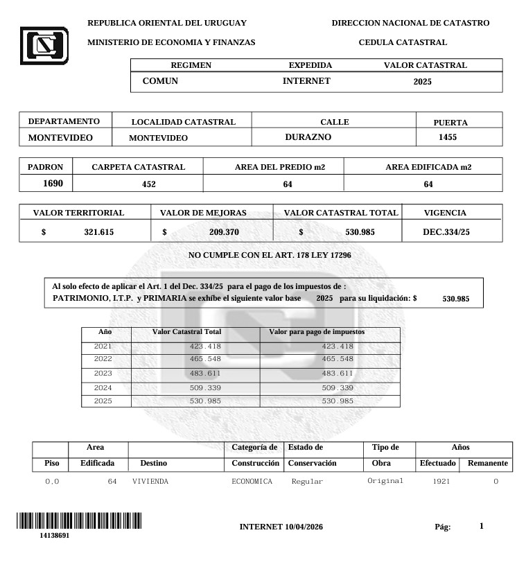 EDICTO: Por disposición del Sr/a. Juez de Paz Departamental Capital de 36º Turno, dictada en autos: “CLAVERO, MARIA DE LOS ANGELES C/ SOSA DE MARIA, ANA MARIACESACION DE CONDOMINIO CESACION DE CONDOMINIO” IUE 2-44116/2010, se hace saber que el próximo jueves 16 de abril de 2026 a las 14:30 horas en el local de la Avenida Uruguay 826, por intermedio del Martillero Pablo Lakierovich, Matrícula Nº 5780, RUT 215178070018, en acto presidido por la Sra. Alguacil de la Sede se procederá a la venta en pública subasta, sin base, al mejor postor y en dólares estadounidenses del siguiente bien inmueble: Solar de terreno con las construcciones y demás mejoras que le acceden, empadronado con el número 1.690 de la Localidad Catastral Montevideo, Departamento de Montevideo, el que según que según plano del Agrimensor Joaquín Spinak inscripto en la Dirección General de Catastro el primero de diciembre de 1983 con el número 3.802, se compone de una superficie de 66 metros y 94 decímetros que se deslinda así: 5 metros y 98 centímetros al Sureste de frente a la calle Durazno, distando su punto extremo 9 metros 88 centímetros de la esquina que forma con la calle Javier Barrios Amorín; 11 metros 12 centímetros al Suroeste lindando con el padrón 1.691; 6 metros 6 centímetros al Noroeste lindando con parte del padrón 1.692; y 11 metros 12 centímetros al Noreste lindando con el padrón 1.689.- SE PREVIENE: a) Se desconoce la situación ocupacional y contributiva del inmueble. b) El estudio de títulos se realizó en base a títulos y testimonios notariales, agregados en autos y en sobre, los que se encuentran en la Sede a disposición. c) Los rubros a descontar del precio de la subasta son los necesarios para la escrituración, esto es Contribución Inmobiliaria, Impuesto Primaria, ITP (mitad) e IRPF. d) Según informe de consulta de deudas de fecha 08/03/2024 (fs. 324 del expediente) surge deuda de Impuesto Primaria por $ 322. Según certificado de Gravámenes de fecha 08/03/2024 (fs. 323 del expediente) no existiría deuda por Tarifa de Saneamiento, Tasa General Municipal ni Contribución Inmobiliaria. Se ignora actual estado de deudas por Contribución Inmobiliaria, Impuesto Primaria o cualquier otro que gravara al bien. Se desconoce en especial si existe deuda ante el BPS. e) Serán de cargo del comprador los gastos de escrituración, honorarios, certificados, la comisión de compra del rematador e impuestos que la ley pone a cargo del comprador. f) Será de cargo del expediente la comisión de venta del bien rematado, o sea el 1,22% sobre el precio de remate, así como los gastos de remate. g) El mejor postor deberá consignar en el acto de serle aceptada su postura el 30% (treinta por ciento) de su oferta por concepto de seña, así como la comisión del rematador más IVA, o sea 3,66% del precio del remate. El saldo de precio deberá ser depositado en el plazo de veinte días corridos, contados a partir del siguiente a la notificación del auto aprobatorio del remate y no será interrumpido por la Feria Judicial ni por Semana de Turismo. h) Los pagos deberán realizarse por los medios previstos por la ley Nº 19.210, modificativas y decretos reglamentarios. Excepcionalmente, si cualquiera de los medios de pago admitidos por la normativa no pudieran ser emitidos por la institución de intermediación financiera que utiliza el mejor postor el día de la almoneda, la Sra. Alguacil dejará constancia de tal situación y procederá a cerrar el acta de remate, prorrogando la diligencia para el día hábil inmediato siguiente, momento en el que deberá abrir una nueva acta para consignar el pago. i) La venta en subasta pública no sanea defectos que la titulación del bien pueda tener, se remata en las condiciones jurídicas y materiales que surgen del expediente, certificados registrales ampliados al 25/03/2026 y documentación presentada, todo lo que se encuentra a disposición de los interesados en la OFGECEN sita en 25 de mayo 500 de Montevideo, debiéndose tener presente el Art. 390 inciso final del CGP. Montevideo, 26 de marzo de 2026. -WALTER ISMAEL RUIZ ALVAREZ, Actuario Adjunto