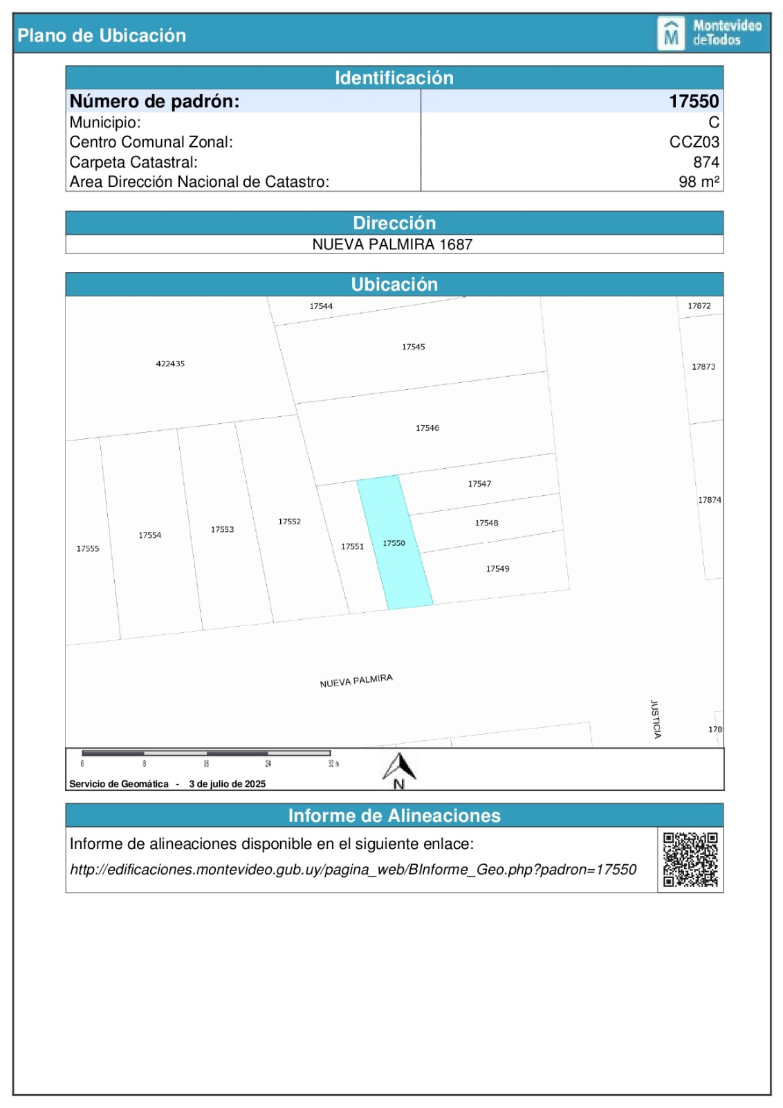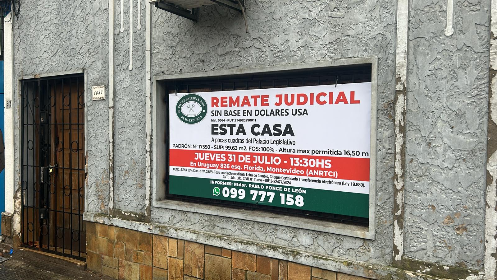 EDICTO:Por disposición del Sr/a. Juez Letrado Civil de 8º Turno, dictada en autos: “TELLECHEA PEREZ, JORGE c/ ESPINOSA BENITEZ, LILIANA – EJECUCIÓN DE HIPOTECA” IUE 2-22477/2024, Por disposición del Sr Juez Letrado de 1ª Instancia en lo Civil de 8º turno de Montevideo, dictada en autos caratulados “TELLECHEA PEREZ, JORGE c/ ESPINOSA BENITEZ, LILIANA – EJECUCIÓN DE HIPOTECA”, se hace saber que el próximo 31 de julio de 2025 a partir de la hora 13:30 en la sede de la ANRTCI (Uruguay 826) por intermedio del Rematador Pablo Ponce de León, Mat. 5564, RUT 214920290011 y presidido por el Sr. Aguacil del Juzgado, se procederá al remate sin base, en dólares americanos y al mejor postor del siguiente bien inmueble: Fracción de terreno con edificio y demás mejoras dominiales que le acceden, sito en el departamento de Montevideo, localidad Catastral Montevideo, empadronado con el Nº 17.550 el que según plano del Ingeniero Agrimensor Miguel Gavirondo de abril de 2006, inscripto en la Dirección Nacional de Catastro el 4 de abril del mismo año con el Nº 31.126, consta de una superficie de 99.63 metros que se deslinda así: 5,80 metros de frente a la calle Nueva Palmira señalada su puerta de entrada con el Nº 1687, 17,40 metros al Oeste lindando con el padrón 17.551, 5,75 metros al norte lindando con padrón 17.546, y 17,41 metros al Este lindando con padrones 17.547, 17.548 y 17.549. SE PREVIENE: 1º Que el mejor postor deberá consignar el 30% de su oferta, en carácter de seña de serle aceptada su postura, así como la comisión del rematador del 3% más IVA, la cual no formara parte de la seña. Dichos pagos deberán realizarse en el acto, y si el precio total de lo rematado superare las U.I. 1.000.000, se hará efectivo mediante LETRA DE CAMBIO, CHEQUE CERTIFICADO O TRANSFERENCIA ELECTRONICA de una entidad bancaria de plaza, cumpliendo así con la normativa vigente (ley Nº 19.889). 2º Que será de cargo del expediente el pago de la comisión e IVA de venta al rematador del 1.22% 3º Que se desconoce el estado ocupacional del bien en la actualidad. 4º Que se desconoce la existencia de deudas de construcción ante el BPS e Intendencia de Montevideo. 5º Que solo podrán ser imputados al precio los tributos necesarios para la escrituración hasta el día del remate y en el caso de existir cuentas en juicio solo se podrá descontar el monto del tributo y no los honorarios judiciales que se originaren, los cuales serán asumidos por quien resultare mejor postor en el remate. 6º Que el plazo para consignar el saldo de precio será de 20 días corridos contados a partir del día hábil siguiente al de la notificación del auto aprobatorio del remate, que no se interrumpirá por las ferias judiciales o semana de turismo. 7º Que quien resulte mejor postor deberá tramitar previamente a la escritura del bien ante la Intendencia correspondiente el certificado referente al derecho de preferencia previsto por el art. 66 de la Ley 18.308. 8º La subasta de realiza en las condiciones que surgen del expediente, información registral y documentación agregada la que se encuentra a disposición de los interesados en la oficina del juzgado, sito en Pasaje de los Derechos Humanos 1309 de Montevideo. Y a los efectos legales se hacen estas publicaciones Montevideo, 26 de junio de 2025. VIRGINIA ELIZABETH MEGA YEREGUI, Actuario Adjunto.