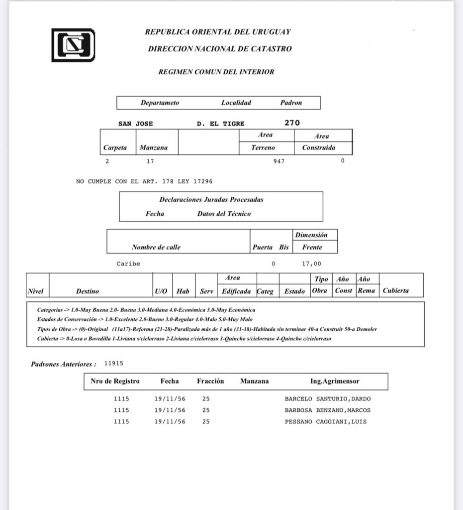 EDICTO: Por disposición del Sr/a. Juez Letrado de Familia de 24º Turno, dictada en autos: “ALDAO BELOSO CARMEN DELFINA C/MONTE MUIÑO MARIA DEL CARMEN;MONTEMUIÑO MARIA DEL ROSARIO Y MONTEMUIÑO JULI CESAR PARTICION-” IUE 65-447/2004, se hace saber que el 18 de noviembre del 2025 a las 13:30 horas en Avenida Uruguay 826, Montevideo, se procederá por intermedio del Rematador MARIO STEFANOLI Mat. 4219 Ruc 211743790012 y presidido por la Sra. Alguacil del Juzgado al remate, sin base, al mejor postor y en dólares estadounidenses de los siguientes bienes inmuebles: A) Solar de terreno con construcciones y demás mejoras que le acceden, sito en la antes 21era sección Judicial de Montevideo localidad catastral Montevideo, zona urbana, empadronado con el nro. 52420 señalado como solar 21 de la manzana G del plano del Ingeniero Raul Regules de noviembre de 1924 del que expidió copia parcial el Agr. Omar Paganini Rocamora en diciembre de 1943 inscripto en la Dirección General de Catastro con el nro. 9613 el 6 de diciembre de 1943 y según el cual consta de un área de 500 mts. Que se deslindan así: 10 mts de frente al NO a la Avenida de las Instrucciones, entre las calles Corneille y Trapani, distando punto medio 35 mts de la esquina con la calle referida en ultimo termino, 50 mts. Al NE lindando con el solar 22, 10 mts al SE lindando con parte del solar 16 y 50 mts. Al SO lindando con los solares 17,18, 19 y 20 todos los solares del mismo plano. B) solar de terreno con sus construcciones y demás mejoras que acceden sito en la antes 10ma Sección Judicial del Departamento de Montevideo, localidad catastral Montevideo zona urbana, empadronado con el nro. 61326 que según plano del Agr. Joaquin Spinak de diciembre de 1962 inscripto en la Dirección General de Catastro con el nro. 45051 el 12/12/1962 consta de un área de 738 mts2 con 22 dms, que se deslinda así: 17 mts con 18 cms de frente al NO a la calle Missisipi entre Avda. Rivera y calle Pilcomayo, distando su punto medio 128 m 94 cms a la esquina con la última; 43 m al SE lindando con parte del padrón 61327; 17 m 22 cm al SO lindando con el padrón 61340 y 42 mts 84 cms al NO lindando con parte del padrón 61325. C) Solar de terreno baldío ubicado en la antes 6ta Sección judicial del Dpto de Maldonado localidad Catastral balneario Buenos Aires, empadronado con el nro. 6522 antes en mayor área padrón 1517, 6009, 6746 y6747 y que según plano del Agrimensor Antonio Odizzio de 1938 inscripto en la Oficina Departamental de Empadronamiento de Maldonado con el nro. 40 el 16 de mayo de 1939 se señala como solar 19 de la manzana 125 según el cual tiene un área de 300 mts que se deslinda así:_ 10 mts de frente al SO a la calle 20, y 30 mts. Al NO, 10 mts al NE y al SE 30 mts. D) Solar de terreno baldío ubicado en la antes 6ta Sección Judicial del Dpto de San Jose localidad Delta del Tigre zona sururbana, empadronado con el nro. 270 antes en mayor área padrón 11915 señalado como solar 25 de la manzana 17 en el plano del Agrimensor Dardo Barcelo, M Barboza y Luis Passano, de mayo de 1956 inscripto en la Dirección General de Catastro Nacional con el nro. 1115 el 29 de noviembre de 1956, según el cual tiene un área de 946 mts 84 dm con frente a Circunvalación Plaza Artigas por 17 mts en línea curva y E) derechos de promitente comprador de solar de terreno baldío sito en la 7ma Sección Judicial del Departamento de Canelones localidad Parque del Plata zona urbana actualmente empadronado con el nro. 7929 antes en mayor área padrón 12180 señalado como solar 6 de la manzana 557 fracción E2, en el plano de mensura y fraccionamiento Francisco L. D. Bellis, inscripto en la Dirección General del Catastro Nacional con el nro. 5719 el 7 de junio de 1950 consta de un área de 499 mts con frente por 15 mts. a la calle W1 entre calle 24 y la Avenida Argentina. SE PREVIENE QUE: 1) El mejor postor deberá consignar el 20% de su oferta en dicho acto en carácter de seña, así como la comisión del rematador más I.V.A. o sea el 3,66% y 12,20% en el caso de los derechos de promitente comprador, de serle aceptada la postura, y si el monto a integrar superare las UI 1.000.000 (unidades indexadas un millón), se hará efectivo mediante letra de cambio, cheque certificado o transferencia electrónica de una entidad bancaria de plaza, cumpliendo así con lo dispuesto por las leyes 19.210, 19.478 y 19.889 en lo pertinente y sus decretos reglamentarios. El saldo de precio deberá ser depositado en plazo de 20 días corridos contados a partir del día hábil siguiente de la notificación del auto aprobatorio del remate, que no será interrumpido por la feria judicial ni semana de Turismo teniendo presente que deberá resguardar los medios de pago (previstos por la ley 19.210, decreto reglamentario y ley 19.889). 2) Será de cargo del expediente el 1,22% y 2,44% de comisión de venta y el 1% municipal. 3) Que los bienes se venden en el estado de conservación y situación jurídica en que se encuentren a la fecha de la subasta. 4) Que se desconoce la existencia de deudas con BPS por construcciones y el estado ocupacional de los bienes. 5) Que se desconoce la existencia de deuda de impuesto de primaria y deuda de contribución inmobiliaria, sólo pudiendo imputar al precio la deuda que exista por dichos rubros. 6) Solo se podrá imputar al precio del remate el 2% de ITP e IRPF por la parte vendedora hasta la suma concurrente. 7) En la sede se encuentra depositada la titulación y antecedentes de los bienes cuya ejecución se pretende, por lo que el remate de los mismos se efectuará en las condiciones que resultan del expediente, de los antecedentes y certificados registrales presentados oportunamente por el ejecutante en autos, los que podrán ser examinados en la Sede por los interesados, debiéndose tener presente el artículo 390 del CGP inciso final. 8) En el acto del remate, el mejor postor y el segundo mejor postor deberán construir 