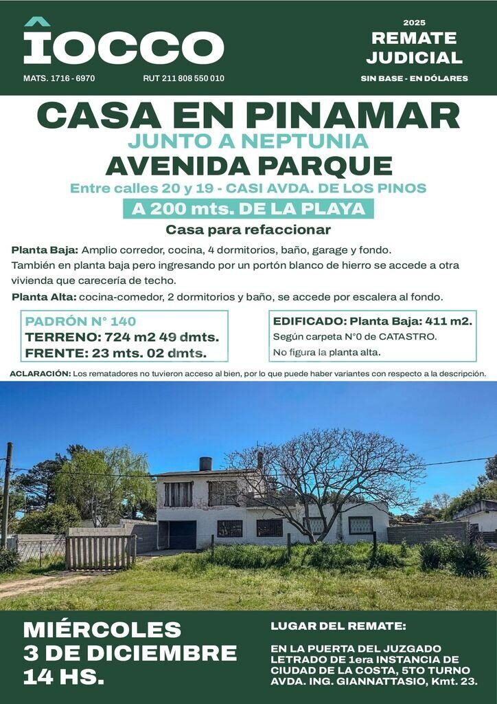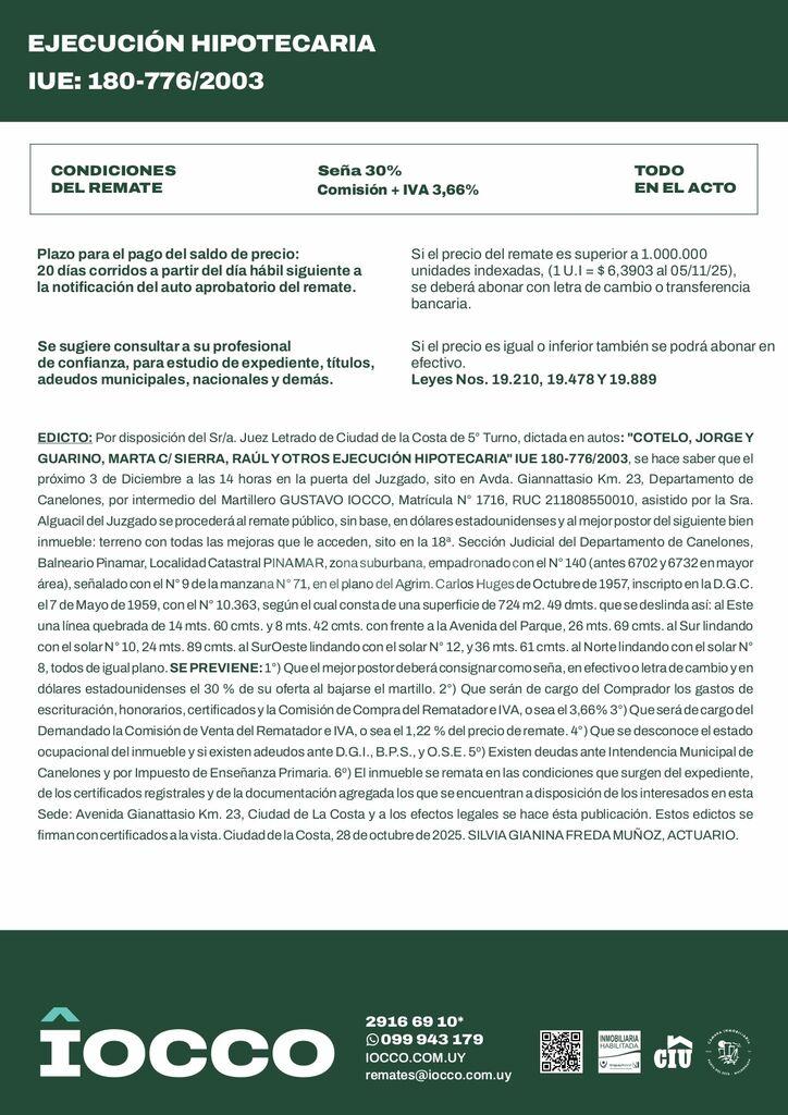 EDICTO: Por disposición del Sr/a. Juez Letrado de Ciudad de la Costa de 5° Turno, dictada en autos: “COTELO, JORGE Y GUARINO, MARTA C/ SIERRA, RAÚL Y OTROS EJECUCIÓN HIPOTECARIA” IUE 180- 776/2003, se hace saber que el próximo 3 de Diciembre a las 14 horas en la puerta del Juzgado, sito en Avda. Giannattasio Km. 23, Departamento de Canelones, por intermedio del Martillero GUSTAVO IOCCO, Matrícula N° 1716, RUC 211808550010, asistido por la Sra. Alguacil del Juzgado se procederá al remate público, sin base, en dólares estadounidenses y al mejor postor del siguiente bien inmueble: terreno con todas las mejoras que le acceden, sito en la 18ª. Sección Judicial del Departamento de Canelones, Balneario Pinamar, Localidad Catastral PINAMAR, zona suburbana, empadronado con el N° 140 (antes 6702 y 6732 en mayor área), señalado con el N° 9 de la manzana N° 71, en el plano del Agrim. Carlos Huges de Octubre de 1957, inscripto en la D.G.C. el 7 de Mayo de 1959, con el N° 10.363, según el cual consta de una superficie de 724 m2. 49 dmts. que se deslinda así: al Este una línea quebrada de 14 mts. 60 cmts. y 8 mts. 42 cmts. con frente a la Avenida del Parque, 26 mts. 69 cmts. al Sur lindando con el solar N° 10, 24 mts. 89 cmts. al SurOeste lindando con el solar N° 12, y 36 mts. 61 cmts. al Norte lindando con el solar N° 8, todos de igual plano. SE PREVIENE: 1°) Que el mejor postor deberá consignar como seña, en efectivo o letra de cambio y en dólares estadounidenses el 30 % de su oferta al bajarse el martillo. 2°) Que serán de cargo del Comprador los gastos de escrituración, honorarios, certificados y la Comisión de Compra del Rematador e IVA, o sea el 3,66% 3°) Que será de cargo del Demandado la Comisión de Venta del Rematador e IVA, o sea el 1,22 % del precio de remate. 4°) Que se desconoce el estado ocupacional del inmueble y si existen adeudos ante D.G.I., B.P.S., y O.S.E. 5º) Existen deudas ante Intendencia Municipal de Canelones y por Impuesto de Enseñanza Primaria. 6º) El inmueble se remata en las condiciones que surgen del expediente, de los certificados registrales y de la documentación agregada los que se encuentran a disposición de los interesados en esta Sede: Avenida Gianattasio Km. 23, Ciudad de La Costa y a los efectos legales se hace ésta publicación. Estos edictos se f irman con certificados a la vista. Ciudad de la Costa, 28 de octubre de 2025. – SILVIA GIANINA FREDA MUÑOZ, ACTUARIO.
