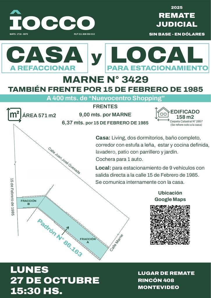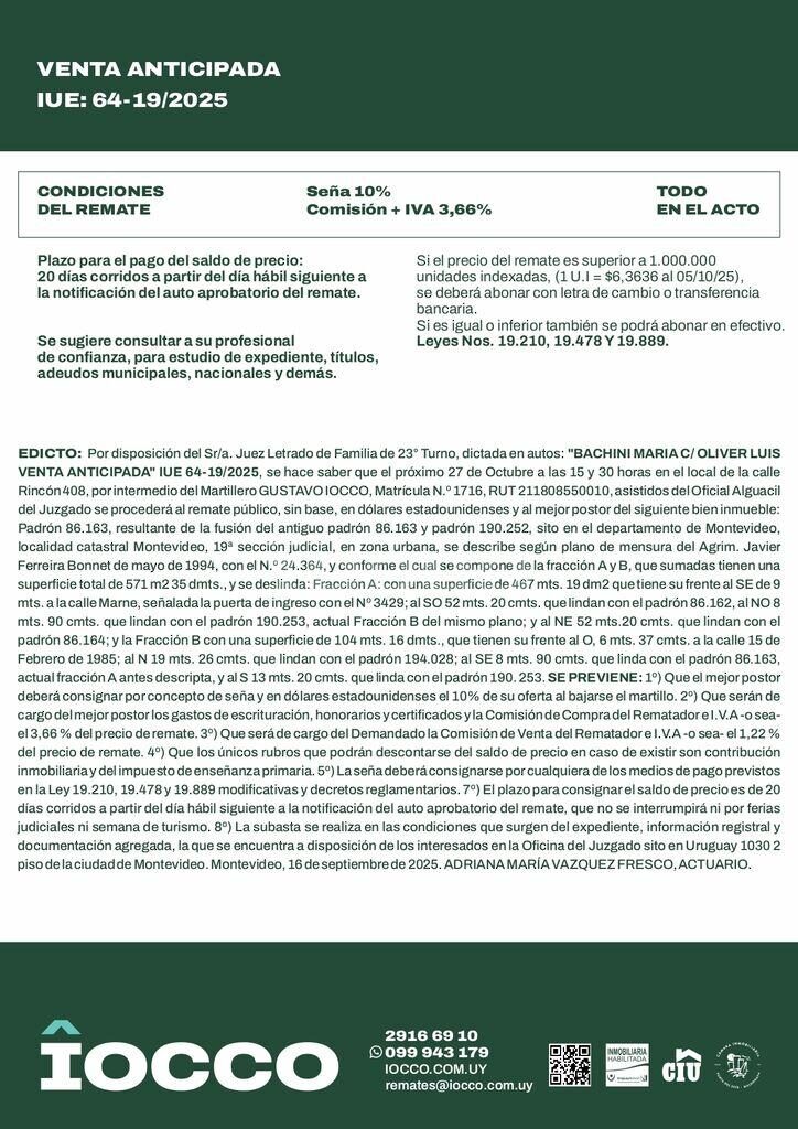 EDICTO: Por disposición del Sr/a. Juez Letrado de Familia de 23º Turno, dictada en autos: “BACHINI MARIA C/ OLIVER LUISVENTA ANTICIPADA” IUE 64-19/2025, se hace saber que el próximo 27 de Octubre a las 15 y 30 horas en el local de la calle Rincón 408, por intermedio del Martillero GUSTAVO IOCCO, Matrícula Nº 1716, RUT 211808550010, asistidos del Oficial Alguacil del Juzgado se procederá al remate público, sin base, en dólares estadounidenses y al mejor postor del siguiente bien inmueble: Padrón 86.163, resultante de la fusión del antiguo padrón 86.163 y padrón 190.252, sito en el departamento de Montevideo, localidad catastral Montevideo, 19ª sección judicial, en zona urbana, se describe según plano de mensura del Agrim. Javier Ferreira Bonnet de mayo de 1994, con el Nº 24.364, y conforme el cual se compone de la fracción A y B, que sumadas tienen una superficie total de 571 m2 35 dmts., y se deslinda: Fracción A: con una superficie de 467 mts. 19 dm2 que tiene su frente al SE de 9 mts. a la calle Marne, señalada la puerta de ingreso con el Nº 3429; al SO 52 mts. 20 cmts. que lindan con el padrón 86.162, al NO 8 mts. 90 cmts. que lindan con el padrón 190.253, actual Fracción B del mismo plano; y al NE 52 mts.20 cmts. que lindan con el padrón 86.164; y la Fracción B con una superficie de 104 mts. 16 dmts., que tienen su frente al O, 6 mts. 37 cmts. a la calle 15 de Febrero de 1985; al N 19 mts. 26 cmts. que lindan con el padrón 194.028; al SE 8 mts. 90 cmts. que linda con el padrón 86.163, actual fracción A antes descripta, y al S 13 mts. 20 cmts. que linda con el padrón 190.253…SE PREVIENE: 1º) Que el mejor postor deberá consignar por concepto de seña y en dólares estadounidenses el 10% de su oferta al bajarse el martillo. 2º) Que serán de cargo del mejor postor los gastos de escrituración, honorarios y certificados y la Comisión de Compra del Rematador e I.V.A -o sea- el 3,66 % del precio de remate. 3º) Que será de cargo del Demandado la Comisión de Venta del Rematador e I.V.A -o sea- el 1,22 % del precio de remate. 4º) Que los únicos rubros que podrán descontarse del saldo de precio en caso de existir son contribución inmobiliaria y del impuesto de enseñanza primaria. 5º) 5º) La seña deberá consignarse por cualquiera de los medios de pago previstos en la Ley 19.210,, 19.478 y 19.889 modificativas y decretos reglamentarios. 7º) El plazo para consignar el saldo de precio es de 20 días corridos a partir del día hábil siguiente a la notificación del auto aprobatorio del remate, que no se interrumpirá ni por ferias judiciales ni semana de turismo..8º) La subasta se realiza en las condiciones que surgen del expediente, información registral y documentación agregada, la que se encuentra a disposición de los interesados en la Oficina del Juzgado sito en Uruguay 1030 2 piso de la ciudad de Montevideo. Montevideo, 16 de septiembre de 2025. -ADRIANA MARÍA VAZQUEZ FRESCO, Actuario.
