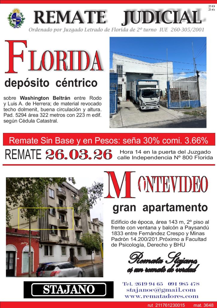 EDICTO: Por disposición del Sr/a. Juez Letrado de Florida de 2° Turno, dictada en autos: “BANCO CENTRAL DEL URUGUAY C/PERLA Y DANIELA SNIADOWER NUEBAUER JUICIO EJECUTIVO (VIENE DE 15º TURNO CIVIL DE MONTEVIDEO)” IUE 260-305/2001, EDICTO. Por disposición del Sr. Juez Letrado de Primer Instancia de Florida de 2º Turno, dictada en autos: “BANCO CENTRAL DEL URUGUAY C/PERLA Y DANIELA SNIADOWER NUEBAUER JUICIO EJECUTIVO (VIENE DE 15º TURNO CIVIL DE MONTEVIDEO)” IUE 260-305/2001, se hace saber que el próximo 26 de marzo de 2026 a la hora 14, frente a las puertas del Juzgado en la calle Independencia N.º 800 de la ciudad de Florida, se procederá por intermedio del martillero Enrique Stajano, matricula 3648 RUT 211761230015, en diligencia presidida por la Señora Alguacil de la Sede, a la venta en subasta pública, sin base, al mejor postor y en moneda nacional, de los siguientes inmuebles empadronados con los números 5294 del departamento y localidad de Florida y 14200/201 del departamento y localidad Montevideo. Descripción y deslinde de los bienes:1) Solar con construcciones y demás mejoras que le acceden empadronado con el número 5.294, señalado como el solar 5 de la manzana 67 de la localidad catastral Florida, en el plano del agrimensor Alfredo Rodríguez Luciardi inscripto ante la oficina departamental de Catastro de Florida el 27/6/1961 con el número 2131, según el cual se compone de una superficie de 321,83 metros que se deslindan así: 10 metros de frente al Noreste de frente a la calle Washington Beltrán, 32,61 metros al Sureste lindando con propiedad de Manuel Preissing y Celestino G. Calzada, 9,74 metros al Suroeste lindando con la fracción “uno” del mismo plano y 32,61 metros al Noroeste lindando con los solares “dos y cuatro” todos del mismo plano. 2 ) Unidad de Propiedad Horizontal DOSCIENTOS UNO, empadronada individualmente con el Nº 14.200/201, sita en la localidad catastral Montevideo, forma parte del edificio construido en régimen de propiedad común e incorporado al régimen de propiedad horizontal de la ley 10.751 de acuerdo a las leyes N.º 13.870 y 13.892, sobre el solar de terreno ubicado en la Localidad Catastral Montevideo padrón matriz N.º 14.200, el que según plano de mensura del Agrimensor Ariel Cabrera inscripto en la Dirección General del Catastro el 29 de agosto de 1972 con el Nº 69.650, tiene un área de 360,85 metros y se deslinda así: 17,40 metros de frente al sureste a la calle Paysandú, por donde está señalada su puerta de entrada con el número 1829, por 21,20 metros lindando al suroeste con el padrón 106.839, 17,60 metros de fondo lindando al noroeste con el padrón 12.204 y 21,27 metros lindando al noreste con parte del padrón 14.203 y parte del padrón 14.221. La unidad 201 tiene un área de 143 metros con 55 decímetros, se ubica a cota vertical más 7,10 metros y le corresponde el uso exclusivo del balcón O1 SE PREVIENE. 1) Que surge del expediente deuda por Impuesto de Enseñanza Primaria y Contribución Inmobiliaria por el padrón N.º 5294 de la Localidad Catastral Florida. 2) Que el padrón N.º 14.200/201 de la Localidad Catastral Montevideo se encuentra gravado con hipoteca recíproca y servidumbre legal. Posee deuda de Impuesto de Enseñanza primaria y se desconoce la existencia de deuda por Contribución Inmobiliaria. Así mismo se advierte que la titulación tiene observaciones, las cuales se encuentran establecidas en el expediente relacionado, por lo que el mejor postor adquirirá en las condiciones establecidas. 3) Que se desconoce el estado de conservación y la situación material y ocupacional de los bienes, así como la existencia de adeudos por aportes a la construcción y deudas ante el BPS y organismo públicos, así como la falta de cumplimiento de la caracterización urbana. 4) Que el mejor postor deberá consignar el 30 % de su oferta en el acto de serle aceptada la misma por concepto de seña, con los medios de pago autorizados por la ley 19210, 19478, 19.889 modificativas y concordantes y sus decretos reglamentarios. 5) Sera de cargo del adquirente, los gastos de escritura, impuestos y demás que la ley pone a su cargo, así como la comisión del martillero 3% más IVA. 6) Sera de cargo del expediente el 1% más IVA por concepto de comisión sobre ventas. 7) Solamente podrán imputarse del precio, los tributos necesarios para la escrituración, esto es contribución inmobiliaria y el tributo de enseñanza primaria. 9) El plazo para consignar el saldo de precio por el mejor postor, será de 20 días corridos a partir del día siguiente a la notificación del auto aprobatorio del remate, que no se interrumpirá por las ferias judiciales ni por semana de turismo. Los bienes se rematan en las condiciones que surgen del expediente de los certificados registrales y de la documentación agregada, todo esto se encuentra a disposición de los interesados en la Sede Judicial en la calle Independencia N.º 800 de la ciudad de Florida. Y a los efectos legales se hacen estas publicaciones. Florida, 04 de marzo de 2026 – CLAUDIA GABRIELA MARTINEZ BERTA, Actuario Adjunto