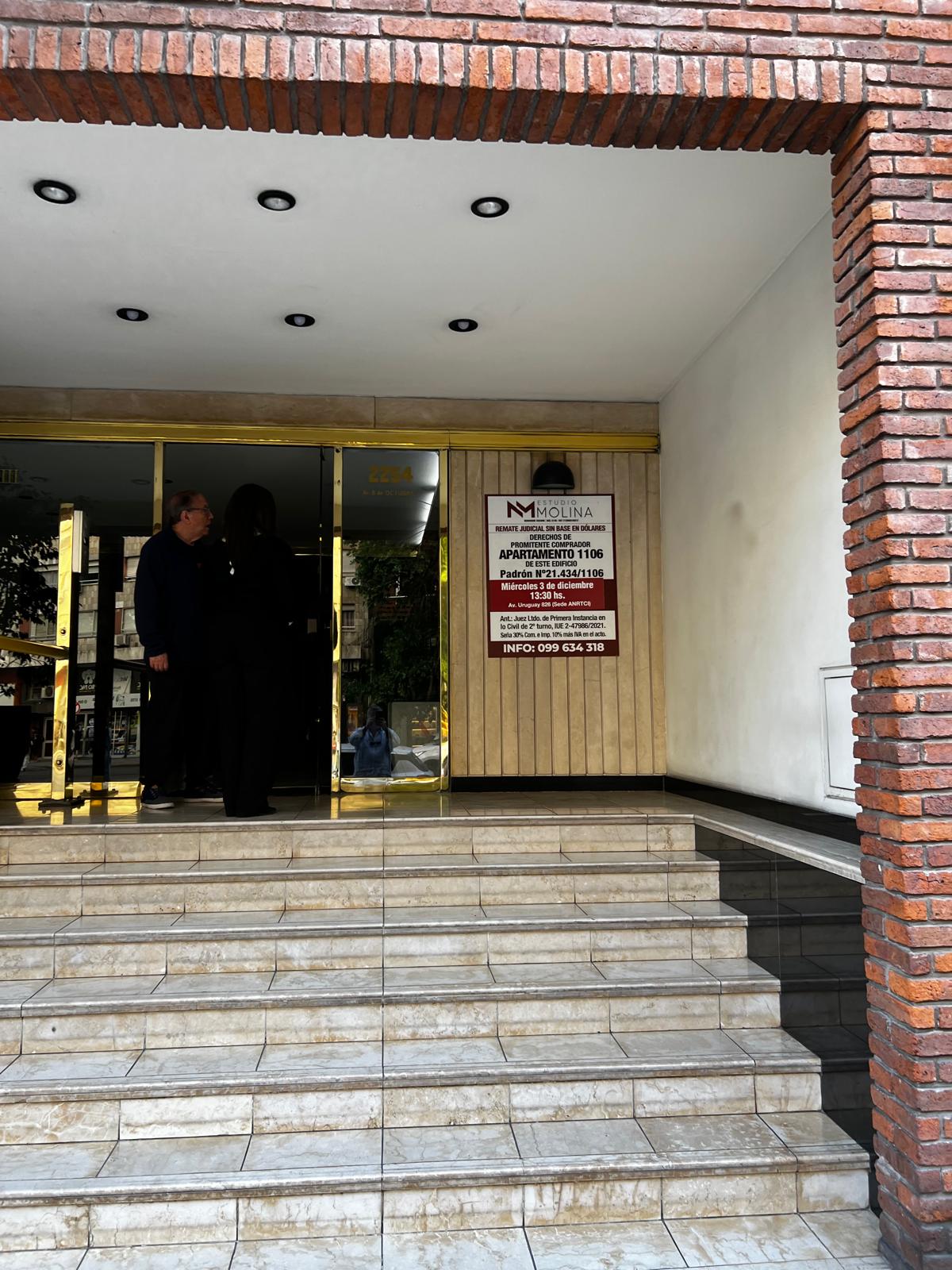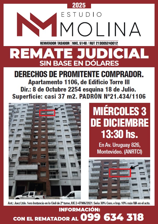 EDICTO: Por disposición del Sr/a. Juez Letrado Civil de 2º Turno, dictada en autos: “EDIFICIO LEYENDAS II A V c/SANTARCIEL SILVERA, DIANA – VIA DE APREMIO” IUE 2-47986/2021, Se hace saber que el próximo 3 de diciembre a las 13:30 horas en el local de la Asociación Nacional de Rematadores, Tasadores y Corredores Inmobiliario sito en la Av. Uruguay 826 se procederá por intermedio del martillero Mario MOLINA ALONSO mat. 5148 rut 213005240012, asistido de la señora alguacil a la venta en pública subasta, sin base, al mejor postor y en dólares estadounidenses de los derechos de promitente comprador de la unidad de propiedad horizontal n.º 1106, empadronada individualmente con el numero Nº 21.434/1106 que integra el Edificio construido en un solar de terreno ubicado en la Localidad Catastral y Departamento de Montevideo, zona urbana, padrón matriz número 21.434, antes números 21.432, 21.433, 21.434 y 21.436, que según plano de mensura y fraccionamiento del Ingeniero Agrimensor Abel Bardaracco Olivera de noviembre de 2011, se encuentra bajo las disposiciones de la Ley de Propiedad Horizontal número 10.751 del 25 de Junio de 1946, cotejado e inscripto en la Dirección General de Catastro con el numero 48171 el día 23 de diciembre de 2015 y tiene un aérea según plano de 1.323 m2 93 dm2 y según título de 1.319 m2 84 dm2 y se deslinda así: 39,05 metros al SUR de frente a la Avenida 18 de Julio; 07,88 metros al SUROESTE también de frente a la calle Duvimioso Terra por ser esquina; uniendo ambos frentes una ochava recta de 5,7 metros; 48,44 metros al NOROESTE de frente a la Avenida 8 de Octubre; 20,16 metros al NORTE lindando con el padrón 21.430; y al NORESTE cuatros tramos rectos de 1;70 metros, 6,50 metros, 4,94 metros; y 16,83 metros lindando con el padrón 21.437. La unidad 1106 según el referido plano se ubica en el Décimo Primer Piso a cota vertical +28,80 metros, tiene una superficie de 36m2 con 69dm2 según reglamento, y de 37 m con 44 dc según título, correspondiéndole el uso exclusivo de los siguientes bienes comunes, Terraza AT 11 y Terraza AU 11. SE PREVIENE: 1- Que el mejor postor deberá consignar por concepto de seña el 30% de su oferta, así como la comisión del rematador todo lo que asciende al 10% más iva de la oferta en el acto; cumpliendo con lo dispuesto por la ley 19.210 y su decreto reglamentario 2- Que serán de cargo del expediente la comisión del rematador o sea 2% más iva, así como los gastos originados por el mismo. 3- Se desconoce la situación ocupacional del bien y la existencia de deudas por construcciones ante la I. M. de Montevideo y el Banco de Previsión Social. 4- Respecto a la situación contributiva del inmueble se informa que existen deudas en la I.M. de Montevideo y en gestión de contribuyentes y deuda del Impuesto de Enseñanza Primaria hasta la fecha del Remate. 5- Únicamente podrá descontarse del saldo de precio lo que se adeudare por Contribución Inmobiliaria e Impuesto de Enseñanza Primaria. 6–Una vez escriturado se reintegrara al mejor postor los conceptos abonados por IRPF e ITP (en caso de corresponder). 7- El mejor postor deberá consignar la seña al momento de bajarse el martillo, con los medios de pago autorizados por la Ley 19.210, modificativas y Ley 19.889. Asimismo deberá depositar el saldo de precio a la orden de la sede y bajo el rubro de autos en el plazo de 20 días corridos, contados a partir del siguiente a la notificación del auto aprobatorio del remate y que no será interrumpido por la Feria Judicial ni por semana de Turismo. 8- El Inmueble se remata en las condiciones que surgen del expediente y la documentación agregada, la que se encuentra a disposición de los interesados en la Sede, sito en el tercer piso del Palacio de los Tribunales Pasaje de los Derechos Humanos 1309 de la ciudad de Montevideo. Montevideo, 04 de noviembre de 2025. -GIMENA PAOLA ETCHEVERRY MARQUEZ, Administrativo III Colaboración Cargo: Actuario Adjunto.