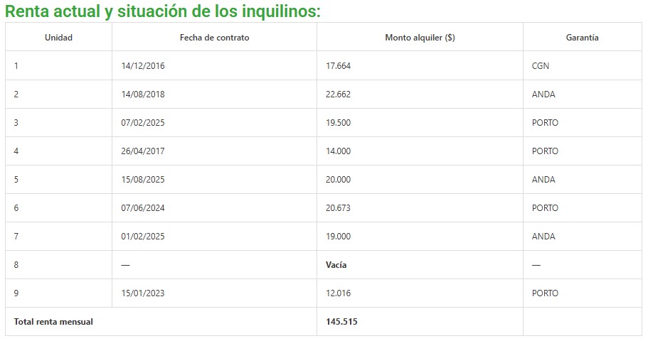 De las 9 unidades, 8 se encuentran arrendadas, generando una renta mensual