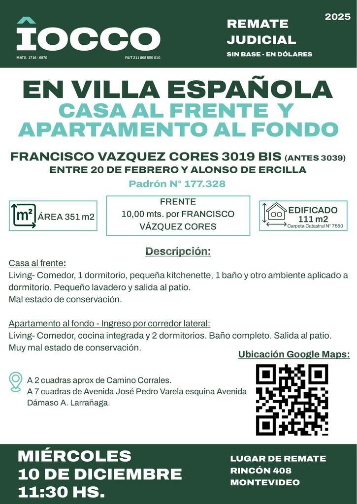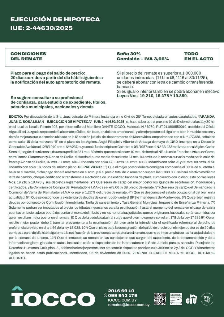 EDICTO: Por disposición del Sr/a. Juez Letrado Civil de 20º Turno, dictada en autos: “ARANDA, JUAN c/ SOSA, LILIAN – EJECUCIÓN DE HIPOTECA” IUE 2- 44630/2025, Por disposición de la Sra. Juez Letrado de Primera Instancia en lo Civil de 20º Turno, dictada en autos caratulados: “ARANDA, JUAN C/ SOSA LILIAN – EJECUCION DE HIPOTECA – IUE: 2- 44630/2025, se hace saber que el próximo 10 de Diciembre a las 11 y 30 hs. en el local de la calle Rincón 408, por intermedio del Martillero DANTE IOCCO, Matrícula Nº 6970, RUT 211808550010, asistido del Oficial Alguacil del Juzgado se procederá al remate público, sin base, en dólares americanos, y al mejor postor del siguiente bien inmueble: terreno y demás mejoras que le acceden ubicado en la 5ª sección judicial del departamento de Montevideo, empadronado con el Nº 177.328, señalado como solar 15 de la manzana “B” en el plano de los Agrims. Ángel Filippini y Alberto de Arteaga de mayo de 1940, inscripto en la Dirección General de Avalúos el 12/8/1940 con el Nº 4237, cuya copia fue inscripta en Catastro el 9/1/1957 con el Nº 33.433 realizada por el Agrim. Carlos Senaldi, según el cual consta de una superficie 351 mts. 80 dmts. que se deslindan: 10 mts. de frente al NE a la calle Francisco Vázquez Cores, entre Tomás Claramount y Alonso de Ercilla, distando el punto medio de su frente 61 mts. 83 cmts. de la ochava curva formada por la calle del frente y Alonso de Ercilla, 37 mts. 37 cmts. al NO lindando con solar 14, 10 mts. 92 cmts. al SO lindando con solar 26 y 32 mts. 99 cmts. al SE lindando con solar 16, todos del mismo plano. SE PREVIENE: 1º) Que el mejor postor deberá consignar como seña el 30 % de su oferta al bajarse el martillo, dicho pago deberá realizarse en el acto, y si el precio total de lo rematado supera las 1.000.000 se hará efectivo mediante letra de cambio, cheque certificado o transferencia electrónica de una entidad bancaria de plaza, cumpliendo con lo dispuesto por las leyes Nos. 19.210 y 19.478 y sus decretos reglamentarios. 2º) Que serán de cargo del mejor postor los gastos de escrituración, honorarios y certificados, y la Comisión de Compra del Rematador e I.V.A -o sea- el 3,66 % del precio de remate. 3º) Que será de cargo del Demandado la Comisión de Venta del Rematador e I.V.A -o sea- el 1,22 % del precio de remate. 4º) Que se desconoce el estado ocupacional del bien en la actualidad.. 5º) Que se desconoce la existencia de deudas de construcción ante el BPS e Intendencia de Montevideo. 6º) Que el bien registra deudas por concepto de Contribución Inmobiliaria, Tarifa de saneamiento y Tasa General Municipal, Impuesto de Enseñanza Primaria. 7º) Solamente podrán ser imputados al precio los tributos necesarios para la escrituración hasta el momento del remate en el caso de existir cuentas en juicio solo se podrá descontar el monto del tributo y no los honorarios judiciales que se originaren, los cuales serán asumidos por quien resultare mejor postor en el remate . 8) Que de la cedula catastral surge que el bien no cumple con el art.178 de la Ley 17.296 9º) Quien resulte mejor postor deberá tramitar previamente a la escrituración del bien ante la Intendencia el certificado referente al derecho de preferencia previsto en el art. 66 de la ley 18.038. 10º) Que el plazo para la consignación del saldo de precio por el mejor postor es de 20 días corridos a partir del día hábil siguiente a la notificación de la providencia aprobatoria del remate, que no se interrumpirá por las ferias judiciales ni por la semana de turismo. 11º) Que el inmueble se remata en las condiciones que surgen del expediente, de la documentación y de la información registral glosada en autos, los cuales están a disposición de los interesados en la Sede Judicial para su consulta, Pasaje de los Derechos Humanos 1309, piso 1º. , debiendo el mejor postor tener presente lo dispuesto por el articulo 390 inciso 2 y 3 del CGP. Y a los efectos legales se hacen estas publicaciones. Montevideo, 06 de noviembre de 2025 – VIRGINIA ELIZABETH MEGA YEREGUI, Actuario Adjunto