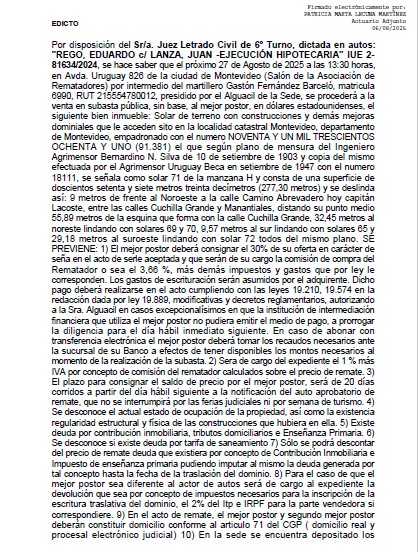 CONDICIONES DE REMATE: El mejor postor deberá consignar el 30% de su oferta, en el acto de serle aceptada la misma, así como la comisión del rematador más IVA o sea el 3,66% y se deberá tener presente lo dispuesto por las Leyes 19.210 de inclusión financiera y demás disposiciones reglamentarias y modificativas. El saldo de precio deberá ser depositado en la cuenta abierta bajo el rubro de autos por el mejor postor, en un plazo de 20 días corridos a partir del día hábil siguiente a la notificación del auto aprobatorio del remate, que no se interrumpirá por ferias judiciales ni por semana de turismo. Será de cargo del expediente la comisión de venta del Rematador más I.V.A, o sea el 1,22 % del precio de remate. La subasta se realiza en las condiciones que surgen del expediente y la documentación presentada que se encuentra a disposición de los interesados en la Oficina Actuaria, Pasaje de los Derechos Humanos 1309.
