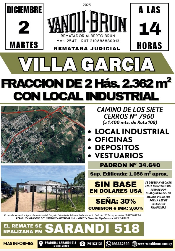 EDICTO: Por disposición del Sr/a. Juez Letrado Civil de 10º Turno, dictada en autos: “BANCO DE LA REPUBLICA ORIENTAL DEL URUGUAY c/ DETRICAR S.A. y otro.-EJECUCION HIPOTECARIA” IUE 21-3/2020, se hace saber que el próximo 2 de diciembre de 2025 a las 14.00 hs. en Peatonal Sarandí 518, se procederá por el martillero ALBERTO BRUN, matricula Nº 2547, RUT 210686880013, en diligencia presidida por la Sra. Alguacil de la Sede, al remate sin base, al mejor postor y en dólares estadounidenses del siguiente bien inmueble: Solar con construcciones ubicado en la 10ª sección judicial del departamento de Montevideo, localidad catastral Montevideo, zona rural, empadronado con el Nro. 34.640, antes fracción 6 del padrón en mayor área Nro. 60.032, que según plano del Agrimensor Hebert Oddonde de setiembre de 1993, inscripto en la Dirección General del Catastro con el Nro. 23.208 el 6 de octubre de 1993, consta de una superficie total de 2 hás. 2.362 mc. 40 dmc. que se deslindan de la siguiente manera: 42,74 mts. al Noroeste de frente a Camino Siete Cerros señalada su puerta con el Nro. 7960 distando 1.463,44 mts. del punto más próximo con la Ruta 102; al Noreste 510,40 mts. lindando con los padrones 60.024 y 408.506; al Sureste 45,12 mts. lindando con Bañados de Carrasco y al Suroeste 510,40 mts. lindando con padrón 34.639. SE PREVIENE: 1) Que el mejor postor deberá consignar por concepto de seña el 30% de su oferta así como la comisión del rematador más IVA (3,66%). 2) Que serán de cargo del comprador los gastos y honorarios de la escritura y los impuestos que la Ley pone a su cargo. 3) Será de cargo del expediente la comisión de venta del Rematador más IVA (1,22%). 4) Que existen deudas por diversos conceptos ante la Intendencia de Montevideo. 5) Que se desconoce la situación ocupacional y material del bien y la existencia de deudas por aportes al BPS e Intendencia de Montevideo por construcciones. 6) Que solamente podrán imputarse al precio de venta los rubros necesarios para la escrituración, esto es Contribución Inmobiliaria e Impuesto de Enseñanza Primaria, no permitiéndose la imputación de gastos generados eventualmente por gestión judicial de cobro. 7) El mejor postor deberá depositar el saldo de precio a la orden de la Sede y bajo el rubro de autos en plazo de 20 días corridos, contados a partir del día hábil siguiente a la notificación del auto aprobatorio del remate y que no será interrumpido por la Feria Judicial ni por Semana de Turismo. 8) Que al momento de efectuar los pagos el mejor postor deberá cumplir con lo dispuesto por la Ley 19.210, sus decretos reglamentarios y Ley 19.889. 9) El inmueble se remata en las condiciones que surgen del expediente y la documentación presentada que se encuentran a disposición de los interesados para su consulta en el Juzgado Letrado en lo Civil de 10º Turno ubicado en Pasaje de los Derechos Humanos 1309, Montevideo. Y a los efectos legales se hacen estas publicaciones. Montevideo, 08 de octubre de 2025. -MARIA SOLEDAD BAGLIVO LOGGIA, Actuario Adjunto