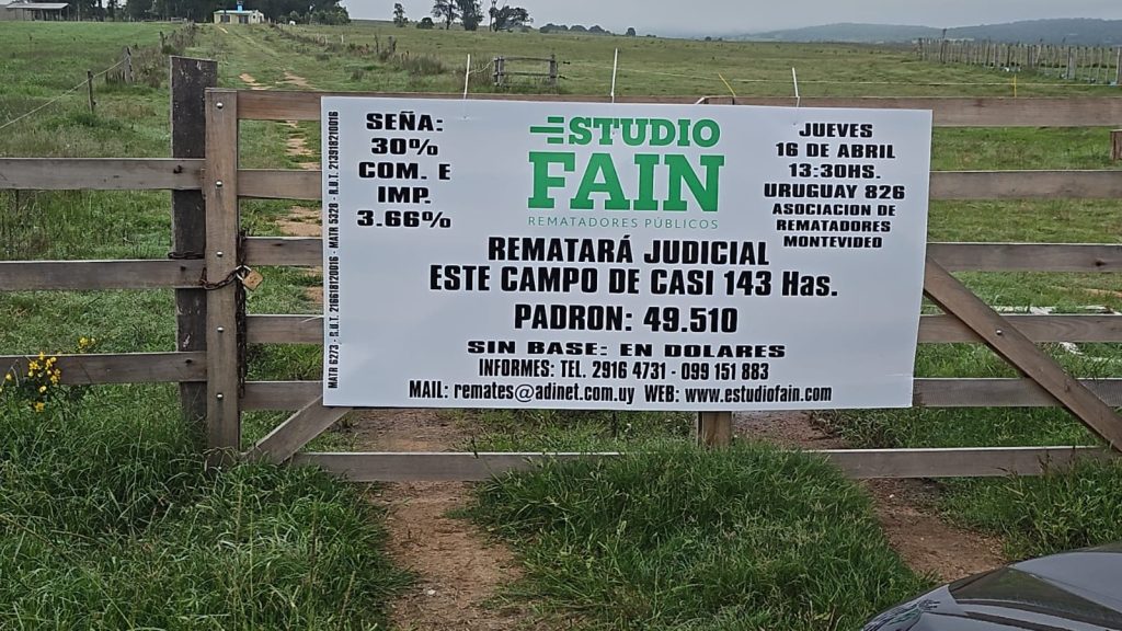 EDICTO: Por disposición del Sr/a. Juez Letrado Civil de 19º Turno, dictada en autos: “SPRITZER DIAMAND, JORGE c/ HERNÁNDEZ PANZL, NESTOR y otro – EJECUCIÓN DE HIPOTECA” IUE 2-54194/2025, se hace saber que el día 16 de abril de 2026 a las 13.30 horas en la Asociación de Rematadores sito en la calle Uruguay 826, se procederá por intermedio del Martillero Sergio Fain, Matrícula Nº 5.328 R.U.T. 213918210016, presidido de la Sra. Alguacil, a la venta en pública subasta, en dólares estadounidenses, sin base y al mejor postor, el siguiente bien inmueble: fracción de campo con alambrados existentes y demás mejoras que le acceden, ubicado en el departamento de Rocha, 3ª sección catastral, paraje “Alférez”, zona rural, empadronado con el N.º 49.510 (antes en mayor área con el numero 3920), señalado con el número 1, en el plano de mensura del Agrimensor Omar A. Hernández de abril de 1995, inscripto en la Oficina Departamental de Catastro de Rocha con el numero 9989 el día 24 de mayo de 1995, según el cual consta de una superficie de 142 hectáreas 7.333 metros, que se deslinda así: Al noroeste 698 metros 30 centímetros de frente a la Ruta numero 13; al norte 489 metros 35 centímetros lindado con padrón 3920 parte; al noreste 1806 metros 8 centímetros lindando con padrón 39.409; al sureste 834 metros 71 centímetros de frente a Camino Vecinal y al suroeste 1.236 metros 84 centímetros lindado con el padrón 3920 parte. Se previene: 1) Que el mejor postor deberá consignar por concepto de seña el 30% de su oferta, así como la comisión del Rematador más I.V.A. (3,66%). Dicho pago deberá realizarse en el acto mediante transferencia bancaria, letra de cambio o en efectivo hasta U.I. 1.000.000 (unidades indexadas un millón). Todo exceso de este último valor se hará efectivo mediante letra de cambio, o transferencia electrónica de una entidad bancaria de plaza, cumpliendo así con lo dispuesto por las Leyes No. 19.210, 19.478 y 19.889 modificativas, concordantes y sus decretos reglamentarios, para el caso de que la normativa referida sufra modificaciones se estará a los montos referidos en la nueva norma que se encuentre vigente al momento del remate. 2) Que serán de cargo del vendedor la comisión e impuestos al Rematador, o sea, 1,22%. 3) Que se desconoce el actual estado de ocupación de la propiedad a rematarse, así como la existencia y regularidad estructural y fiscal de las construcciones que hubiera en ella. 4) Que solo se podrá descontar del precio de remate las deudas que existieran por concepto de Contribución Inmobiliaria e Impuesto de Enseñanza Primaria pudiéndose imputar al mismo la deuda generada por tal concepto hasta la fecha del remate y al momento de la integración del precio, no pudiéndose incluir en tales conceptos los honorarios de los abogados de las administraciones involucradas cuando existiera juicio tendiente a recuperar los tributos adeudados. 5) Que para el caso que el mejor postor sea diferente al actor de autos, será de cargo del expediente la devolución de lo que se abone por concepto de impuesto necesarios para la inscripción de la escritura traslativa de dominio, ITP e IRPF si correspondiere. 6) Que en la Sede se encuentra depositado los antecedentes dominiales originales del bien cuya ejecución se pretende, por lo que el remate del mismo se efectuará en las condiciones que resultan del expediente y documentación y certificados registrales presentados oportunamente por el ejecutante en autos los que podrán ser examinados en la Sede por los interesados. 7) Que el mejor postor deberá dar cumplimiento en todo lo que refiera a las leyes 19.210 y la 19.574 en la redacción dada por la Ley 19.889, o la normativa vigente al momento del remate 8) Que el plazo para consignar el saldo del precio es de 20 días corridos a partir del día hábil siguiente a la notificación del auto aprobatorio del remate, que no se interrumpirá ni por las ferias judiciales ni semana de Turismo. 9) Que la subasta se realiza en las condiciones que surgen del expediente, información registral y documentación agregada, la que se encuentra a disposición de los interesados en la Oficina del Juzgado sito en el Palacio de los Tribunales, Pasaje de los Derechos Humanos 1309 Segundo Piso de la Ciudad de Montevideo. Y a los efectos legales se expide el presente, en Montevideo Montevideo, 23 de marzo de 2026. -MARTÍN LUIS MOLLER CAL, Actuario Adjunto.