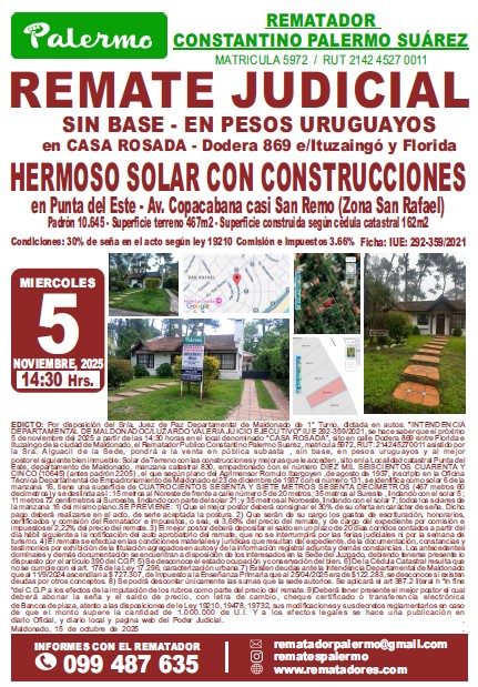 EDICTO: Por disposición del Sr/a. Juez de Paz Departamental de Maldonado de 1° Turno, dictada en autos: “INTENDENCIA DEPARTAMENTAL DE MALDONADOC/LUZARDO VALERIA JUICIO EJECUTIVO” IUE 292-359/2021, se hace saber que el próximo 5 de noviembre del 2025 a partir de las 14:30 horas en el local denominado “CASA ROSADA”, sito en calle Dodera 869 entre Florida e Ituzaingo de la ciudad de Maldonado, el Rematador Publico Constantino Palermo Suarez, matricula 5972, RUT: 214245270011 asistido por la Sra. Alguacil de la Sede, pondrá a la venta en pública subasta , sin base, en pesos uruguayos y al mejor postor el siguiente bien inmueble: Solar de Terreno con las construcciones y mejoras que le acceden , sito en la Localidad catastral Punta del Este, departamento de Maldonado, manzana catastral 830, empadronado con el número DIEZ MIL SEISCIENTOS CUARENTA Y CINCO (10645) (antes padrón 2205) , el que según plano del Agrimensor Romulo Ibargoyen ,de agosto de 1937, inscripto en la Oficina Técnica Departamental de Empadronamiento de Maldonado el 23 de diciembre de 1937 con el número 131, se identifica como solar 6 de la manzana 16, tiene una superficie de CUATROCIENTOS SESENTA Y SIETE METROS SESENTA DECÍMETROS (467 metros 60 decímetros) y se deslinda así : 15 metros al Noreste de frente a calle número 5 de 20 metros; 35 metros al Sureste , lindando con el solar 5 ; 11 metros 72 centímetros al Suroeste, lindando con parte del solar 21; y 35 metros al Noroeste, lindando con el solar 7; todos los solares de la manzana 16 del mismo plano.SE PREVIENE: 1) Que el mejor postor deberá consignar el 30% de su oferta en carácter de seña. Dicho pago deberá realizarse en el acto, de serle aceptada la postura. 2) Que serán de su cargo los gastos de escrituración, honorarios, certificados y comisión del Rematador e impuestos, o sea, el 3,66% del precio del remate, y de cargo del expediente por comisión e impuestos el 2,22% del precio del remate. 3) El mejor postor deberá depositar el saldo en un plazo de 20 días corridos contados a partir del día hábil siguiente a la notificación del auto aprobatorio del remate, que no se interrumpirá por las ferias judiciales ni por la semana de turismo. 4) El remate se efectúa en las condiciones materiales y jurídicas que resultan del expediente, de la documentación, constancias y testimonios por exhibición de la titulación agregados en autos y de la información registral adjunta y demás constancias. Los antecedentes domínales y demás documentación se encuentran a disposición de los interesados en la Sede del Juzgado, debiendo tenerse presente lo dispuesto por el artículo 390 del CGP. 5) Se desconoce el estado ocupación y conservación del bien. 6) De la Cédula Catastral resulta que no se cumple con el art. 178 de la Ley 17.296, caracterización urbana.7) Existen deudas ante la Intendencia Departamental de Maldonado que al 11/9/2024 ascendían a $ 727.307, de Impuesto a la Enseñanza Primaria que al 25/04/2025 era de $122.283, se desconoce si existen deudas por otros conceptos. 8) Se podrá descontar únicamente las sumas que la sede autorice. Se aplicará el art 387.2 literal h “in fine “del C.G.P a los efectos de la imputación de los rubros como parte del precio del remate. 9) Deberá tener presente el mejor postor el cual deberá abonar la seña y el saldo de precio, con letra de cambio, cheque certificado o transferencia electrónica de Bancos de plaza, atento a las disposiciones de le Ley 19210, 19478, 19732, sus modificaciones y sus decretos reglamentarios en caso de que el monto supere la cantidad de 1.000.000 de U.I. Y a los efectos legales se hace una publicación en diario Oficial, y diario local y pagina web del Poder Judicial. Maldonado, 15 de octubre de 2025 KATHERINE ESTHER HENRY MARCHÁN, Actuario Adjunto