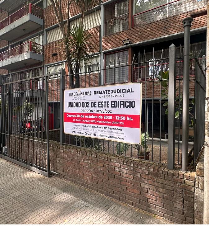 REMATE JUDICIAL SIN BASE EN U$S MIÉRCOLES 3 DE DICIEMBRE 13:30 HORAS En A.N.R.T.C.I. – AV. URUGUAY 826 – MONTEVIDEO DERECHOS DE PROMITENTE COMPRADOR Apto. 1106 de Edificio Torre III 8 de Octubre 2254 esquina 18 de julio Superficie: casi 37 m² Padrón: 21.434/1106 Seña 30% Com. e Imp. 10% […]