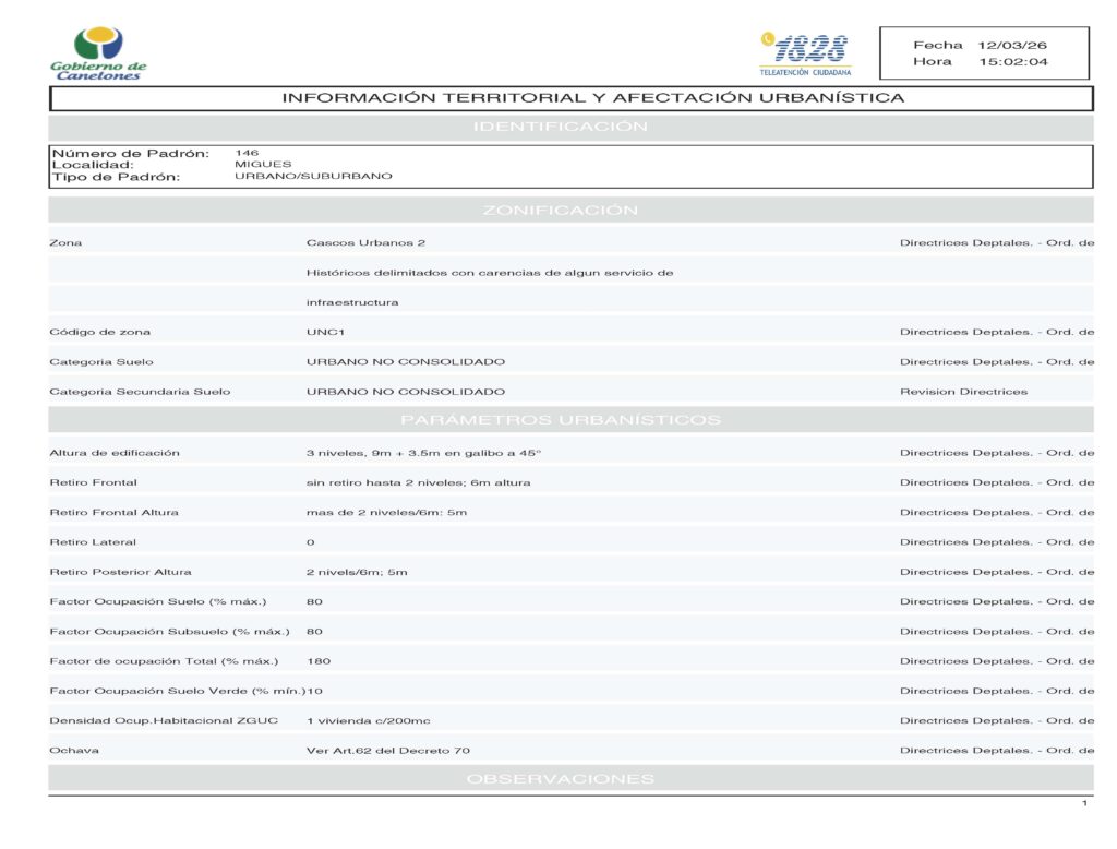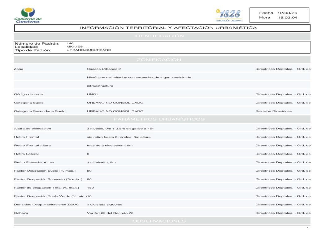 Padrón: 146, Manzana 13 Solar 1, Migues, Canelones.