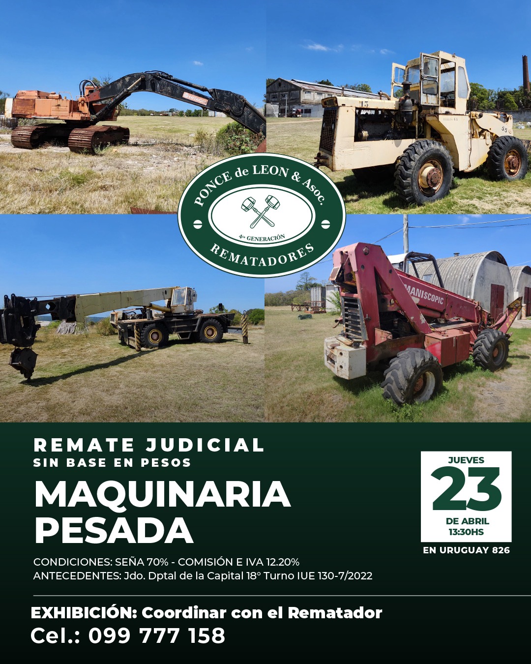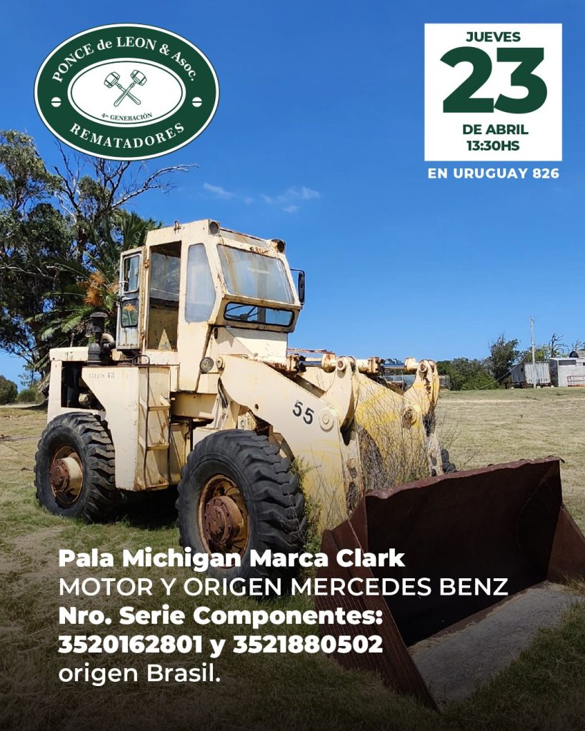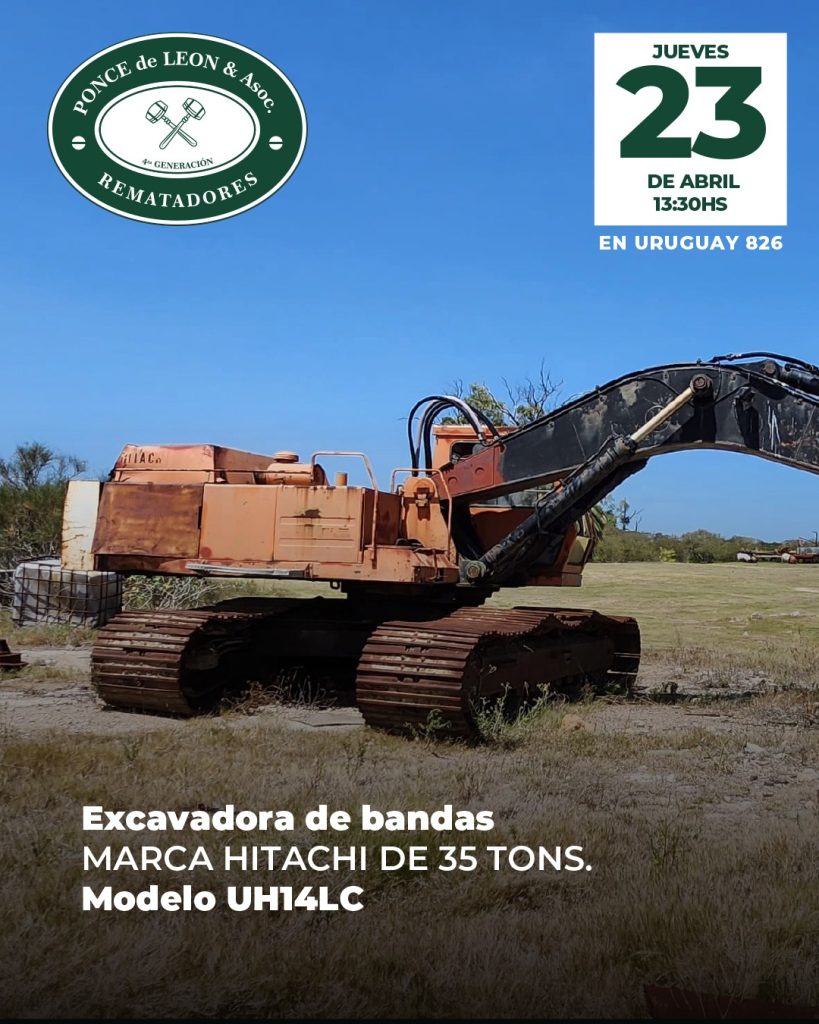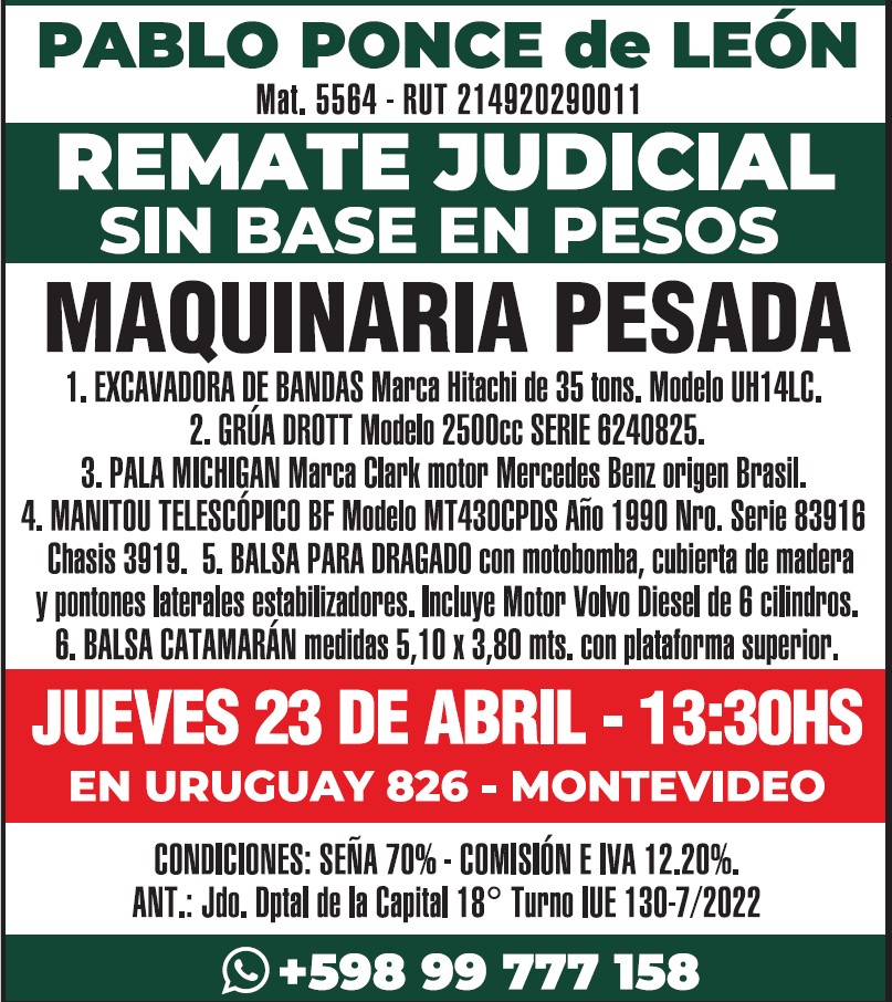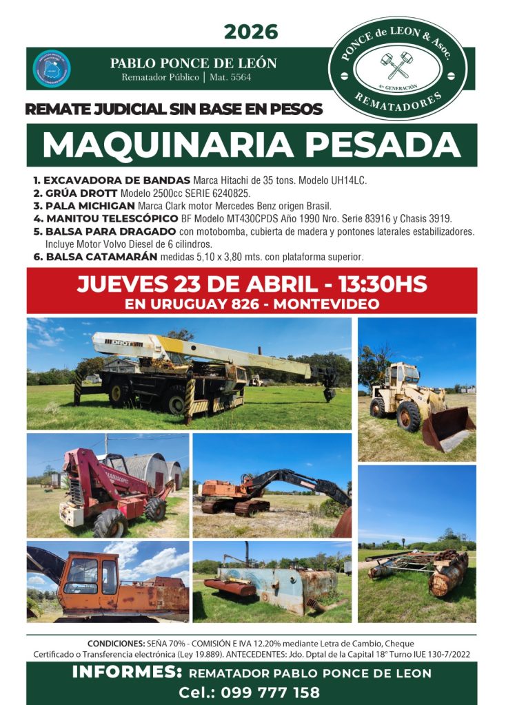 EDICTO: Por disposición del Sr/a. Juez de Paz Departamental Capital de 18º Turno, dictada en autos: “CASTIGLIONE FERRES, JORGE c/ NILBESTONE SA – COBRO EJECUTIVO DE ALQUILERES” IUE 130- 7/2022, se hace saber que el próximo Jueves 23 de Abril a partir de la hora 13.30 en la Sede de la Asociación de Rematadores del Uruguay (ANRTCI) sita en la Av. Uruguay 826, por intermedio del rematador Pablo Ponce de León, matricula 5564, RUT 214920290011 y en acto presidido por el Sr Alguacil del juzgado, se procederá a la venta en pública subasta sin base y al mejor postor de los siguientes bienes muebles: 1) EXCAVADORA DE BANDAS Marca Hitachi de 35 tons. Modelo UH143LC, MFG No. 157 – 0799.- 2) GRÚA DROTT Modelo 2500 cc SERIE 6240825, Capacity BJ 1978.- 3) PALA MICHIGAN Marca Clark Motor Mercedes Benz Nro. Serie Componentes: 3520162801 y 3521880502 Origen Brasil. 4) MANITOU TELESCÓPICO BF Modelo MT430CPDS – Año 1990 Nro. Serie 83916 y Chasis 3919. 5) BALSA PARA DRAGADO con motobomba, rectangular, medidas 5,70 mts. largo x 2,80 mts. ancho con cubierta de madera y pontones laterales estabilizadores con Motor Volvo Diesel de 6 cilindros Serie THD 10182 – 1360 – 32147.- 6) BALSA CATAMARÁN color blanco y medidas 5,10 mts. x 3,80 mts. con plataforma superior. SE PREVIENE: 1) Que el mejor postor deberá abonar en el acto de serle aceptada su oferta en concepto del seña el 70% de la misma, más el 12.20% de comisión e impuestos correspondiente al rematador, cumpliendo con lo dispuesto por la Ley 19210, redacción Ley 19889, modificativas y concordantes, teniendo presente que si el precio total de lo rematado superare las U.I. 1.000.000, se hará efectivo mediante LETRA DE CAMBIO, CHEQUE CERTIFICADO o TRANSFERENCIA ELECTRÓNICA de una entidad bancaria de plaza, cumpliendo así con la normativa vigente.- 2) Que el plazo para consignar el saldo de precio será de 20 días corridos contados a partir del día hábil siguiente al de la notificación del auto aprobatorio del remate, que no se interrumpirá por las ferias judiciales o semana de turismo, estando a cargo mejor postor gastos de traslados.- 3) Que será de cargo del expediente el pago de la comisión de venta al rematador del 2.44% porcentaje calculado sobre el precio del remate. 4) Que se desconoce el estado material y jurídico en que se encuentran los bienes objeto de remate, así como su funcionamiento o deudas, no surgiendo agregados a los presentes autos documentos a su respecto, debiéndose tener presente art.390 inc. Final del CGP. 5) Que el expediente y documentación disponible queda a disposición para ser consultada por los interesados, en la Sede sito en la calle 25 de mayo N° 500. Montevideo, 27 de marzo de 2026 – ROSANA ESPINO ZECCHI, Actuario Adjunto