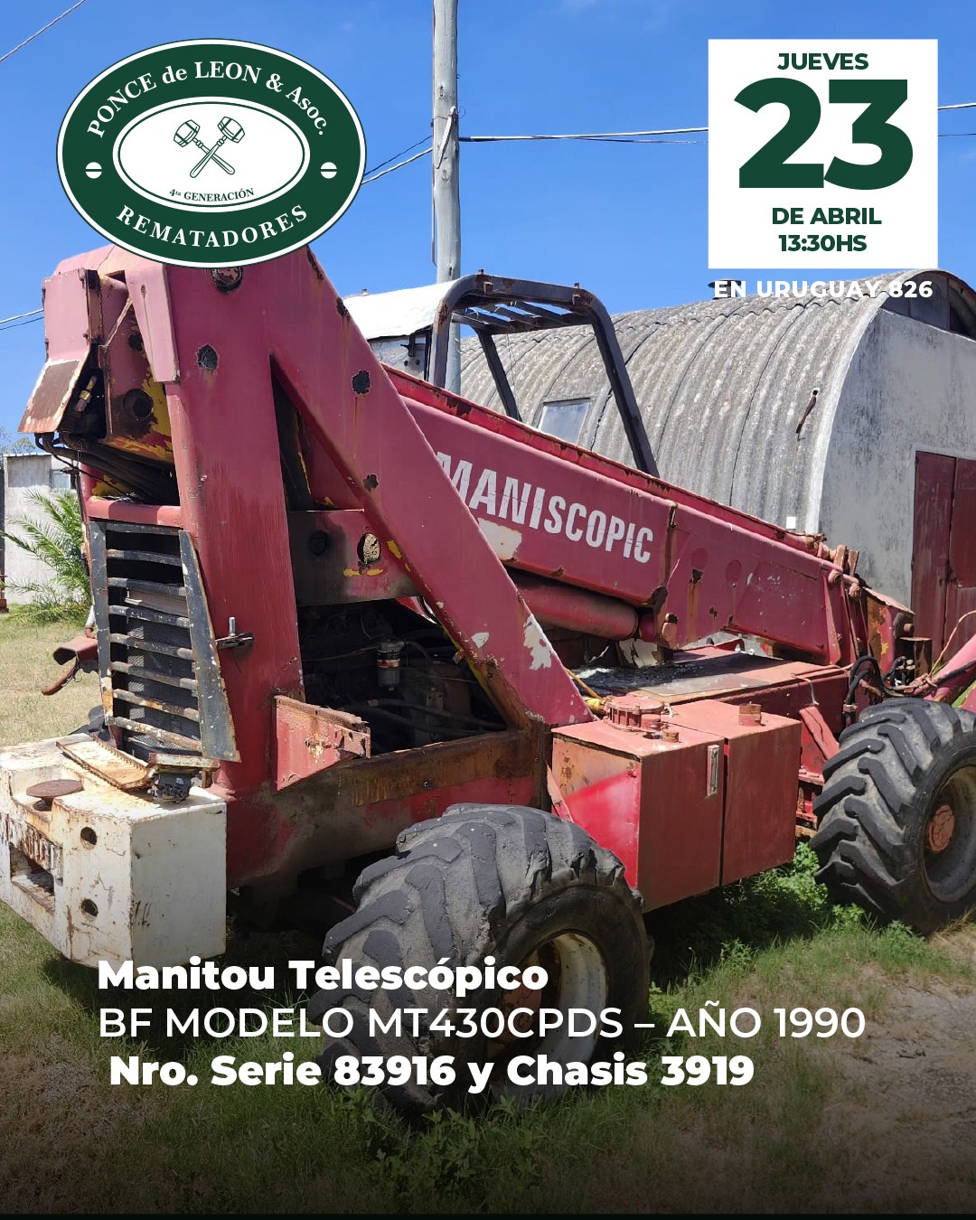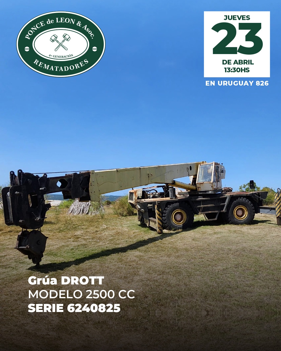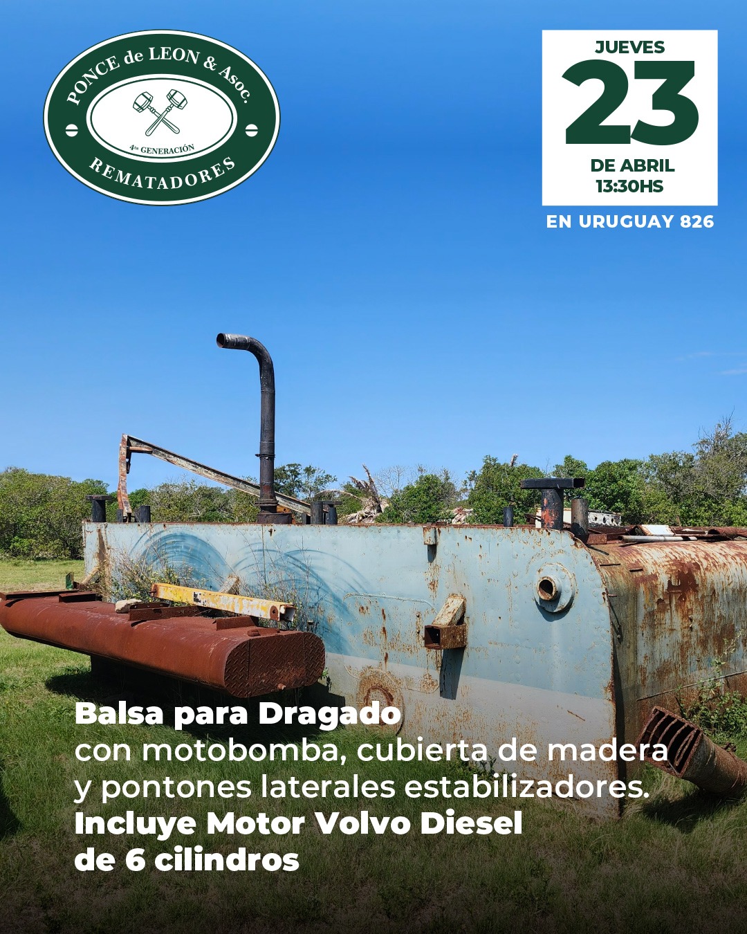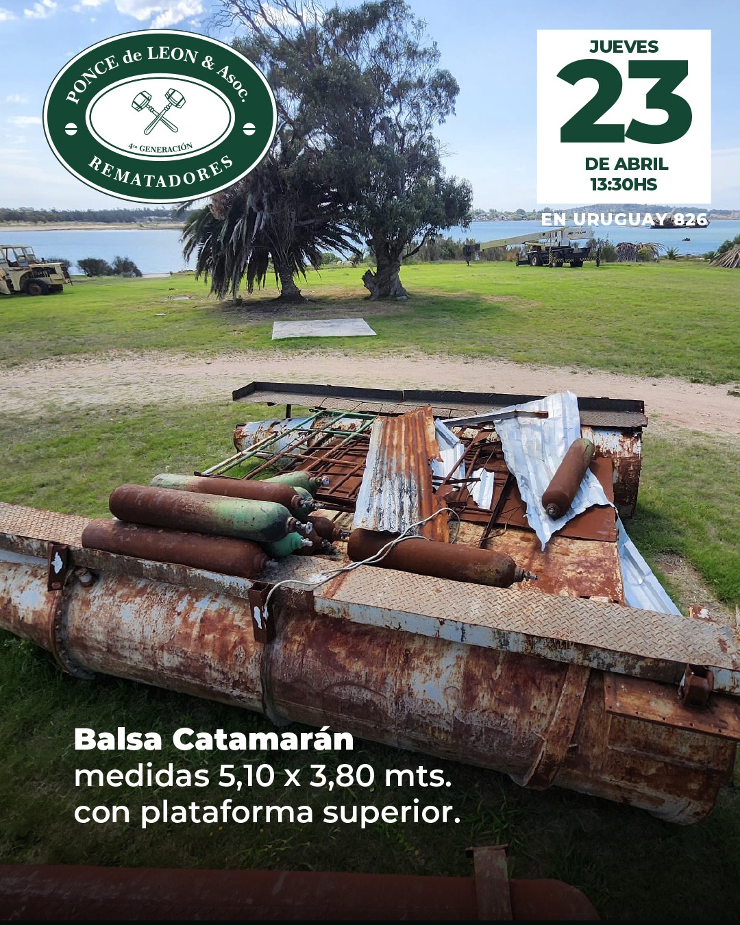 EDICTO: Por disposición del Sr/a. Juez de Paz Departamental Capital de 18º Turno, dictada en autos: “CASTIGLIONE FERRES, JORGE c/ NILBESTONE SA – COBRO EJECUTIVO DE ALQUILERES” IUE 130- 7/2022, se hace saber que el próximo Jueves 23 de Abril a partir de la hora 13.30 en la Sede de la Asociación de Rematadores del Uruguay (ANRTCI) sita en la Av. Uruguay 826, por intermedio del rematador Pablo Ponce de León, matricula 5564, RUT 214920290011 y en acto presidido por el Sr Alguacil del juzgado, se procederá a la venta en pública subasta sin base y al mejor postor de los siguientes bienes muebles: 1) EXCAVADORA DE BANDAS Marca Hitachi de 35 tons. Modelo UH143LC, MFG No. 157 – 0799.- 2) GRÚA DROTT Modelo 2500 cc SERIE 6240825, Capacity BJ 1978.- 3) PALA MICHIGAN Marca Clark Motor Mercedes Benz Nro. Serie Componentes: 3520162801 y 3521880502 Origen Brasil. 4) MANITOU TELESCÓPICO BF Modelo MT430CPDS – Año 1990 Nro. Serie 83916 y Chasis 3919. 5) BALSA PARA DRAGADO con motobomba, rectangular, medidas 5,70 mts. largo x 2,80 mts. ancho con cubierta de madera y pontones laterales estabilizadores con Motor Volvo Diesel de 6 cilindros Serie THD 10182 – 1360 – 32147.- 6) BALSA CATAMARÁN color blanco y medidas 5,10 mts. x 3,80 mts. con plataforma superior. SE PREVIENE: 1) Que el mejor postor deberá abonar en el acto de serle aceptada su oferta en concepto del seña el 70% de la misma, más el 12.20% de comisión e impuestos correspondiente al rematador, cumpliendo con lo dispuesto por la Ley 19210, redacción Ley 19889, modificativas y concordantes, teniendo presente que si el precio total de lo rematado superare las U.I. 1.000.000, se hará efectivo mediante LETRA DE CAMBIO, CHEQUE CERTIFICADO o TRANSFERENCIA ELECTRÓNICA de una entidad bancaria de plaza, cumpliendo así con la normativa vigente.- 2) Que el plazo para consignar el saldo de precio será de 20 días corridos contados a partir del día hábil siguiente al de la notificación del auto aprobatorio del remate, que no se interrumpirá por las ferias judiciales o semana de turismo, estando a cargo mejor postor gastos de traslados.- 3) Que será de cargo del expediente el pago de la comisión de venta al rematador del 2.44% porcentaje calculado sobre el precio del remate. 4) Que se desconoce el estado material y jurídico en que se encuentran los bienes objeto de remate, así como su funcionamiento o deudas, no surgiendo agregados a los presentes autos documentos a su respecto, debiéndose tener presente art.390 inc. Final del CGP. 5) Que el expediente y documentación disponible queda a disposición para ser consultada por los interesados, en la Sede sito en la calle 25 de mayo N° 500. Montevideo, 27 de marzo de 2026 – ROSANA ESPINO ZECCHI, Actuario Adjunto