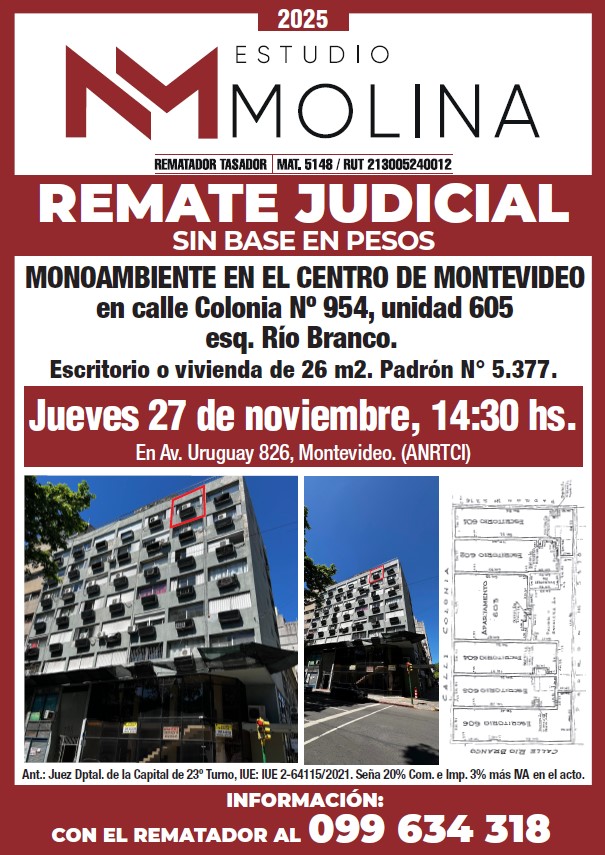 EDICTO: Por disposición del Sr/a. Juez de Paz Departamental Capital de 23o Turno, dictada en autos: “EDIFICIO BUEMES c/ SUCESORES DE NION CRUZADO, JOSÉ – EJECUCIÓN DE HIPOTECA RECÍPROCA” IUE 2-64115/2021, se hace saber que el próximo 27 de Noviembre a las 14:30 horas en el local de la ANRTCI sito en Av. Uruguay 826, se procederá por intermedio del martillero Mario MOLINA ALONSO mat. 5148 rut 213005240012, asistido de la señora alguacil a la venta en pública subasta, sin base en moneda nacional y al mejor postor, del siguiente bien inmueble: Unidad de Propiedad horizontal 605 que forma parte del edificio construido de acuerdo al régimen d la Ley 10.751 en el terreno sito en el Departamento de Montevideo, localidad Catastral Montevideo, zona urbana, empadronado con el número CINCO MIL TRESCIENTOS SETENTA Y SIETE (5.377), en el que según plano de mensura y fraccionamiento horizontal del Ingeniero Agrimensor José Luis González Fonticelli de marzo de 1982, cotejado por el servicio del Plan Regulador de la intendencia Municipal de Montevideo el 17 de junio de 1983 e inscripto en la Dirección General de Catastro Nacional el 30 de Junio de 1983 con el número 3112, consta de una superficie de doscientos treinta y seis metros cuadrados cincuenta y dos decímetros cuadrados (236 metros cuadrados 52 decímetros cuadrados), con 11 metros 6 centímetros al Oeste de frente a la calle Rio Branco y 21 metros 44 centímetros al Norte también de frente a la calle Colonia por ser esquina . La unidad 605 esta empadronada individualmente con el número CINCO MIL TRESCIENTOS SETENTA Y SIETE BARRA SEISCIENTOS CINCO (5377/605), y según el citado plano se ubica en el sexto piso a cota vertical más 19 metros 81 centímetros, y consta de una superficie de VEINTICINCO METROS CUADRADOS OCHENTA DECIMETROS (25 metros cuadrados 80 decímetros cuadrados). SE PREVIENE: 1- El estudio de títulos se formuló en base a testimonios notariales por exhibición, desconociéndose si se ha tramitado la sucesión del causante José Luis Nion Cruzado. 2- No cumple con el art. 178 de la Ley 17.296. 3- Se desconoce el estado de regularidad de las construcciones, su estado ocupacional, afectaciones, como así su situación tributaria y estado de deudas ante diferentes organismos (BPS, DGI, Intendencia de Montevideo, etc.). Tiene deuda de Impuesto de Contribución Inmobiliaria e Impuesto de Enseñanza Primaria). 4- El mejor postor deberá abonar el 20% de su oferta en el acto de serle aceptada su postura, la que deberá consignarse por cualquiera de los medios de pago previstos por la Ley 19.210, modificativas y decretos reglamentarios. 5- El plazo para consignar el saldo de precio es de 20 días corridos a partir del primer día hábil siguiente a la notificación del auto aprobatorio del remate, que no se interrumpirá ni por las ferias judiciales ni semana de turismo, La cancelación deberá realizarse y documentarse de acuerdo a la ley 19.210, modificativas y decretos reglamentarios. 6- El mejor postor deberá además abonar en el acto de remate la comisión e impuestos de cargo del comprador, totalizando el 3,66% el precio del remate. Solamente podrán ser imputados al precio los tributos necesarios para la escrituración hasta el momento del remate; en el caso de existir cuentas en juicio solo se podrá descontar el monto del tributo y no los honorarios judiciales que se originaren, los cuales serán asumidos por quien resultare mejor postor en el remate. El ITP de la parte vendedora y el IRPF, en caso de corresponder, serán reintegrados al mejor postor luego de la escrituración, siempre que exista saldo suficiente.7- Los gastos de escrituración y todos aquellos que la ley pone de su cargo, serán asumidos por el adquirente. 8- Que será de cargo del ejecutado la comisión de venta más el IVA que totaliza el 1,22% del precio, así como los impuestos municipales. 9- Quien resulte mejor postor en el remate deberá tramitar previamente a la escrituración del bien ante la intendencia correspondiente el certificado referente al derecho de preferencia previsto por el artículo 66 de la Ley 19.308. 10- LA subasta se realiza en las condiciones que surgen del expediente, información registral y documentación agregada, la que se encuentra a disposición de los interesados en la oficina de OFGECEN, 25 de Mayo 500 Segundo piso de la ciudad de Montevideo. A los efectos legales se expide el presente habiéndose tenido a la vista las ampliaciones de los certificados registrales No2912409 y No2929456 ambos de fecha 30/10/2025, y los No3233768 y No2929459 ambos de fecha 3/11/2025. Montevideo, 03 de noviembre de 2025 – VERÓNICA MARIELA MERLANO CONDE, Actuario de Jdos. de Paz