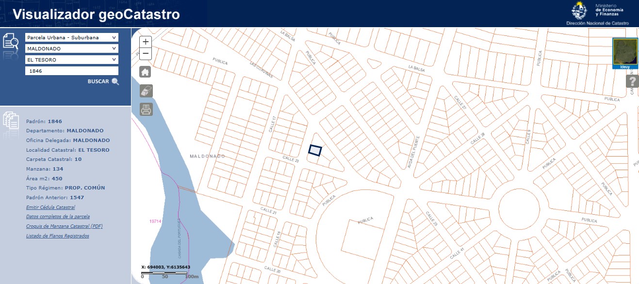 EDICTO: Por disposición del Sr/a. Juez de Paz Departamental de Maldonado de 3° Turno, dictada en autos: “INTENDENCIA DEPARTAMENTAL DE MALDONADO c/ LOORES, DINORA y otros – JUICIO EJECUTIVO TRIBUTARIO” IUE 2-21417/2023 , se hace saber que el próximo Viernes 17 de Octubre de 2025, a la Hora 14:00, en el Local Casa Rosada, ubicado en la calle José Dodera No. 869, entre las calles Florida e Ituzaingó de la ciudad de Maldonado, por intermedio del martillero Gustavo ALVAREZ ALZUGARAY, matrícula 5722, RUT 100356560011, asistido por la Alguacil del Juzgado, se procederá al Remate Público SIN BASE y en DOLARES ESTADOUNIDENSES del siguiente bien Inmueble: solar de terreno sito en la localidad catastral El Tesoro, departamento de Maldonado, manzana catastral 134, empadronado con el número MIL OCHOCIENTOS CUARENTA Y SEIS (1846), (padrón anterior 1547 en mayor área), el que según plano de mensura y fraccionamiento del Agrimensor Carlos A. Mac Coll de Octubre de 1945, inscripto en la Oficina Departamental de Catastro de Maldonado con el número 61 el 25 de marzo de 1946, se identifica como solar 4 de la manzana 22, tiene una superficie de 450 m2 (Cuatrocientos cincuenta metros cuadrados), y se deslinda así: al Oeste 18 metros de frente a la calle número 16, al Norte 25 metros, lindando con el solar 5; al Este 18 metros, lindando con parte del solar 6 y al Sur 25 metros, lindando con solar 3; todos de la misma manzana y plano. SE PREVIENE: 1) Que el mejor postor deberá consignar en carácter de seña el 30% de su oferta a cuenta del precio final, en el acto de serle aceptada la postura y en dólares usa. 2) Serán de cargo del comprador los gastos de escrituración, honorarios certificados y la comisión del Rematador e Impuestos, o sea el 3,66% del precio del remate, y de cargo del expediente por comisión e Impuestos el 2,22% del precio del remate. 3) El mejor postor deberá depositar el saldo en un plazo de 20 días corridos contados a partir del día hábil siguiente al de la notificación del auto aprobatorio del remate, que no se interrumpirá por las ferias judiciales ni por la semana de turismo. 4) Los antecedentes dominiales y demás documentación se encuentran a disposición de los interesados en la Sede del Juzgado, testimonio por exhibición de los títulos. 5) Se desconoce el estado conservación y ocupacional del bien. 6) Deberá tener presente el mejor postor el cual deberá abonar la seña y el saldo de precio, con letra de cambio, cheque certificado o transferencia electrónica de Bancos de Plaza, atento a las disposiciones de la Ley 19210, 19478, 19732, sus modificaciones y su Decreto Reglamentario, en caso de que el monto supere la cantidad de1:000.000 de UI. (Unidades Indexadas). 8) Rubros autorizados a imputar como parte del precio del Remate: Contribución Inmobiliaria, Impuesto a las Trasmisiones Patrimoniales, en la proporción correspondiente a la parte enajentante, e Impuesto a la Renta de las Personas Físicas de corresponder. 9) Existe deuda por concepto de contribución inmobiliaria. Se desconoce si existen deudas por otros conceptos. 10) Y a los efectos legales se realiza una Publicación en el Diario Oficial y Diario Local y en la página del Poder Judicial. Maldonado, 25 de septiembre de 2025 – MICAELA JUDITH BONILLA NUÑEZ, Administrativo III Colaboración Cargo: Actuario Adjunto