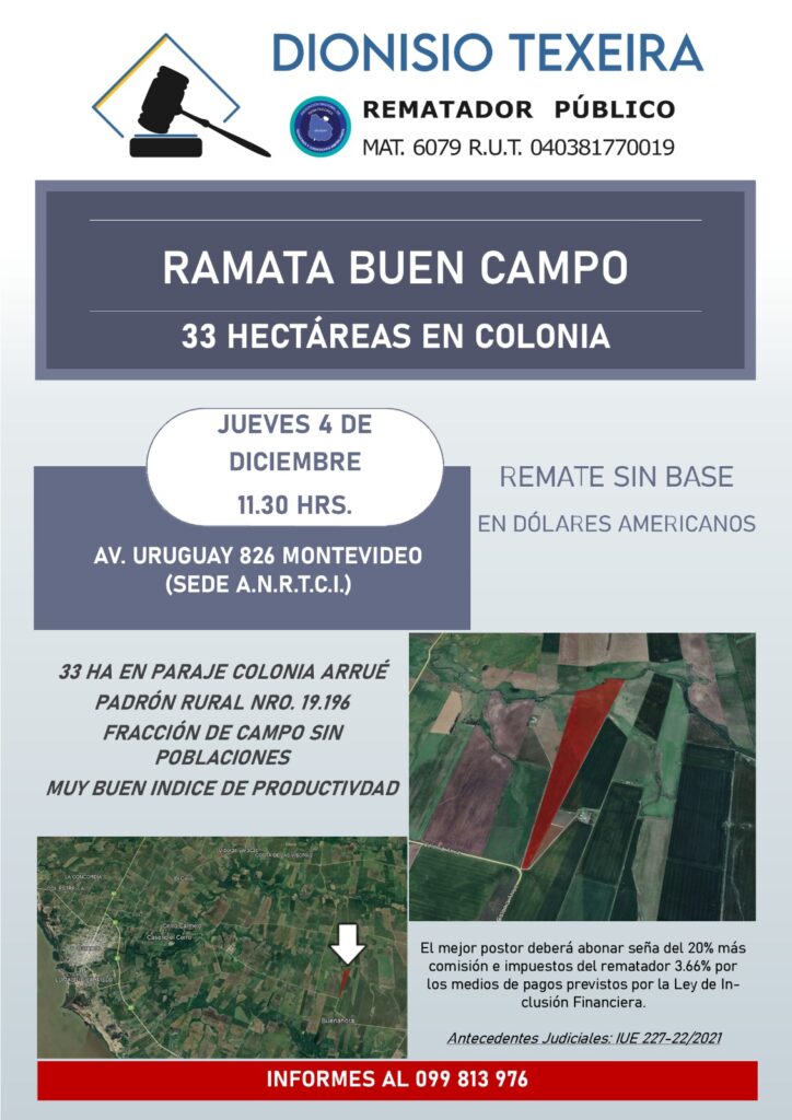 Se previene: – Remate privado en el marco de liquidación concursal Ley 18.387. “MARÍA DEL ROSARIO BANCHERO CONCURSO LEY” IUE: 227-22/2021 Juzgado Letrado de Carmelo 2° Turno Colonia. – Se remata FRACCIÓN DE CAMPO y mejoras anexas, ubicado en paraje “Colonia Arrué”, zona rural de la sexta sección catastral del Departamento de Colonia, empadronada con el número DIECINUEVE MIL CIENTO NOVENTA Y SEIS (19.196), antes en mayor área con el número nueve mil setecientos setenta y uno (9.771), señalada como FRACCIÓN UNO en el plano del Agrimensor Daniel A. Merif Bozzino de agosto de 1991, inscripto en la Dirección General del Catastro Nacional el 30 de septiembre del mismo año con el número 10.551, según el cual consta de una superficie de TREINTA Y TRES HECTÁREAS, SIETE MIL QUINIENTOS NOVENTA Y NUEVE METROS, y se deslinda así: 35 metros de frente al sur, a camino vecinal 17 metros de ancho, al Oeste, 1624 metros 90 centímetros con el padrón 4441; al Norte con Cañada de Arroyo; y al Este 1903 metros 40 centímetros en parte con fracción 2 del mismo plano y en el resto, con padrón 7972.- Esta fracción soporta servidumbre de paso de 10 metros de ancho en su límite con el padrón 7972, para dar salida a camino vecinal, a fracción 2 del mismo plano. – Que la subasta será sin base y al mejor postor, en dólares americanos. – El mejor postor deberá consignar en carácter de seña el 20% de su oferta en el acto de serle aceptada la postura, más el 3,66% por comisión e impuestos, mediante los medios de pago electrónicos previstos por la Ley de Inclusión Financiera. – El saldo de precio deberá integrarse en un plazo máximo de 60 días corridos desde la fecha de la subasta, el que será simultáneo con la escrituración del bien, sólo podrá prorrogarse por justa causa, por paros en los registros públicos, bancos o demás informes necesarios para la realización de la escrituración. – El bien se encuentra con arrendamiento inscripto. – Una vez formulada la oferta y aceptada la misma, quien la hace acepta el título y las condiciones del remate. – Los Títulos de Propiedad se encuentran guardados en la Caja de Seguridad del Juzgado Letrado de Primera Instancia de Carmelo de 2do. Turno, bajo la IUE: 227-159/2022. – Las deudas por tributos municipales o nacionales o de cualquier naturaleza, no son de cargo del adquirente (art.177 del LCRE), las que una vez celebrada la escritura de compraventa y acreditada su inscripción se libraran los oficios correspondientes para su exoneración.