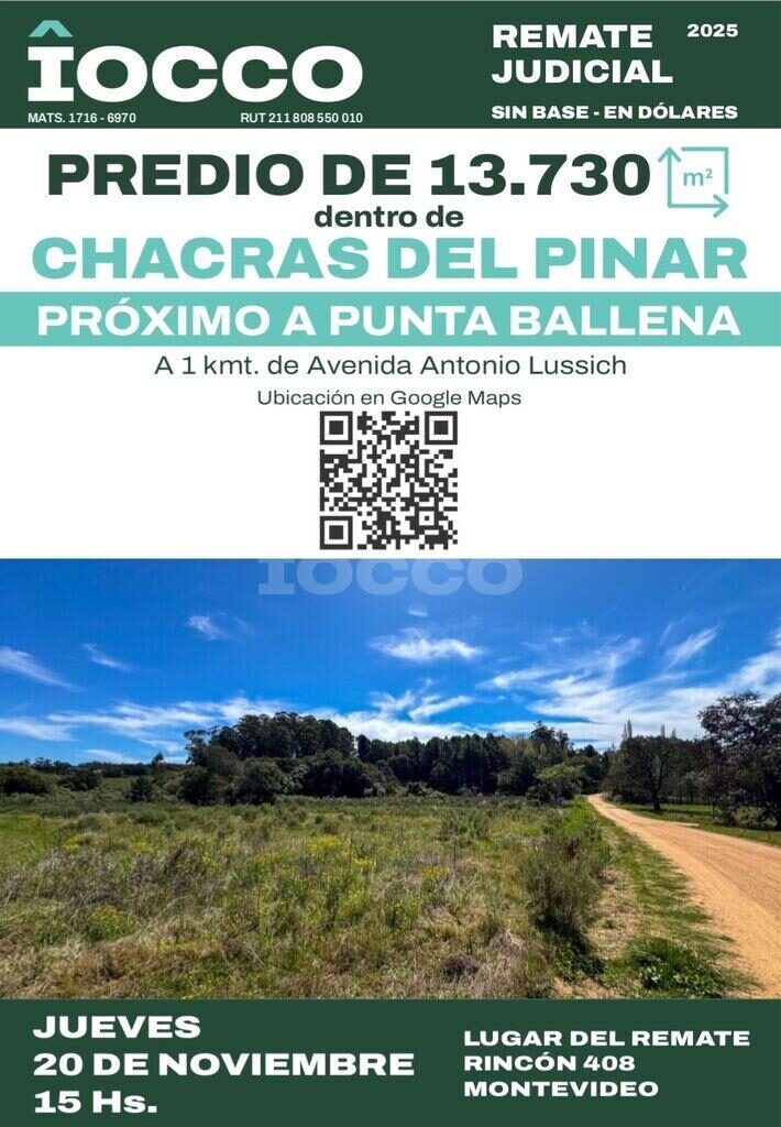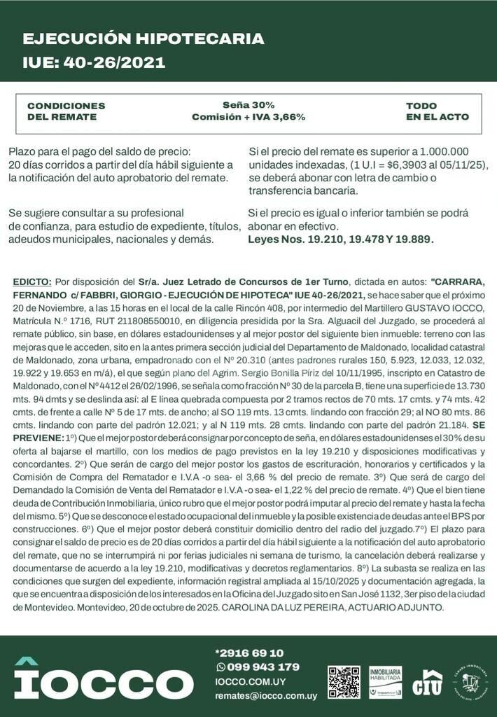 EDICTO: Por disposición del Sr/a. Juez Letrado de Concursos de 1er Turno, dictada en autos: “CARRARA, FERNANDO c/ FABBRI, GIORGIO – EJECUCIÓN DE HIPOTECA” IUE 40-26/2021, se hace saber que el próximo 20 de Noviembre, a las 15 horas en el local de la calle Rincón 408, por intermedio del Martillero GUSTAVO IOCCO, Matrícula N.º 1716, RUT 211808550010, en diligencia presidida por la Sra. Alguacil del Juzgado, se procederá al remate público, sin base, en dólares estadounidenses y al mejor postor del siguiente bien inmueble: terreno con las mejoras que le acceden, sito en la antes primera sección judicial del Departamento de Maldonado, localidad catastral de Maldonado, zona urbana, empadronado con el Nº 20.310 (antes padrones rurales 150, 5.923, 12.033, 12.032, 19.922 y 19.653 en m/á), el que según plano del Agrim. Sergio Bonilla Píriz del 10/11/1995, inscripto en Catastro de Maldonado, con el Nº 4412 el 26/02/1996, se señala como fracción Nº 30 de la parcela B, tiene una superficie de 13.730 mts. 94 dmts y se deslinda así: al E línea quebrada compuesta por 2 tramos rectos de 70 mts. 17 cmts. y 74 mts. 42 cmts. de frente a calle Nº 5 de 17 mts. de ancho; al SO 119 mts. 13 cmts. lindando con fracción 29; al NO 80 mts. 86 cmts. lindando con parte del padrón 12.021; y al N 119 mts. 28 cmts. lindando con parte del padrón 21.184. SE PREVIENE: 1º) Que el mejor postor deberá consignar por concepto de seña, en dólares estadounidenses el 30% de su oferta al bajarse el martillo, con los medios de pago previstos en la ley 19.210 y disposiciones modificativas y concordantes. 2º) Que serán de cargo del mejor postor los gastos de escrituración, honorarios y certificados y la Comisión de Compra del Rematador e I.V.A -o seael 3,66 % del precio de remate. 3º) Que será de cargo del Demandado la Comisión de Venta del Rematador e I.V.A -o sea- el 1,22 % del precio de remate. 4º) Que el bien tiene deuda de Contribución Inmobiliaria, único rubro que el mejor postor podrá imputar al precio del remate y hasta la fecha del mismo. 5º) Que se desconoce el estado ocupacional del inmueble y la posible existencia de deudas ante el BPS por construcciones. 6º) Que el mejor postor deberá constituir domicilio dentro del radio del juzgado.7º) El plazo para consignar el saldo de precio es de 20 días corridos a partir del día hábil siguiente a la notificación del auto aprobatorio del remate, que no se interrumpirá ni por ferias judiciales ni semana de turismo, la cancelación deberá realizarse y documentarse de acuerdo a la ley 19.210, modificativas y decretos reglamentarios. 8º) La subasta se realiza en las condiciones que surgen del expediente, información registral ampliada al 15/10/2025 y documentación agregada, la que se encuentra a disposición de los interesados en la Oficina del Juzgado sito en San José 1132, 3er piso de la ciudad de Montevideo. Montevideo, 20 de octubre de 2025. – CAROLINA DA LUZ PEREIRA, ACTUARIO ADJUNTO.