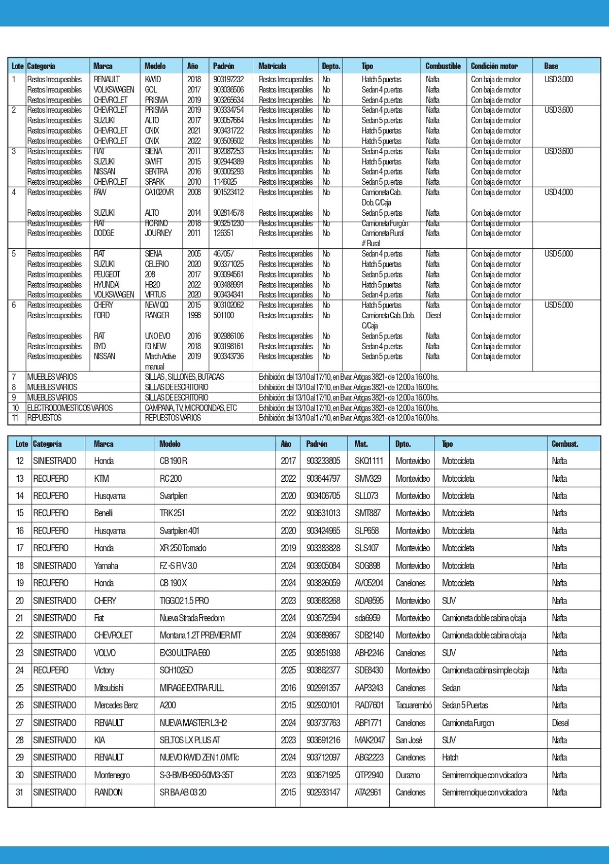 NOTA: Del lote 7 al 11 se exhibirán en Bvar. Artigas 3821.