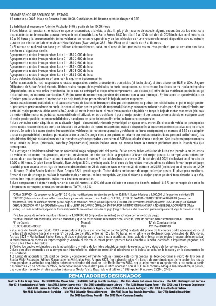 Seña: 30%. – Efectivo, cheque, letra de cambio o transferencia de BROU a