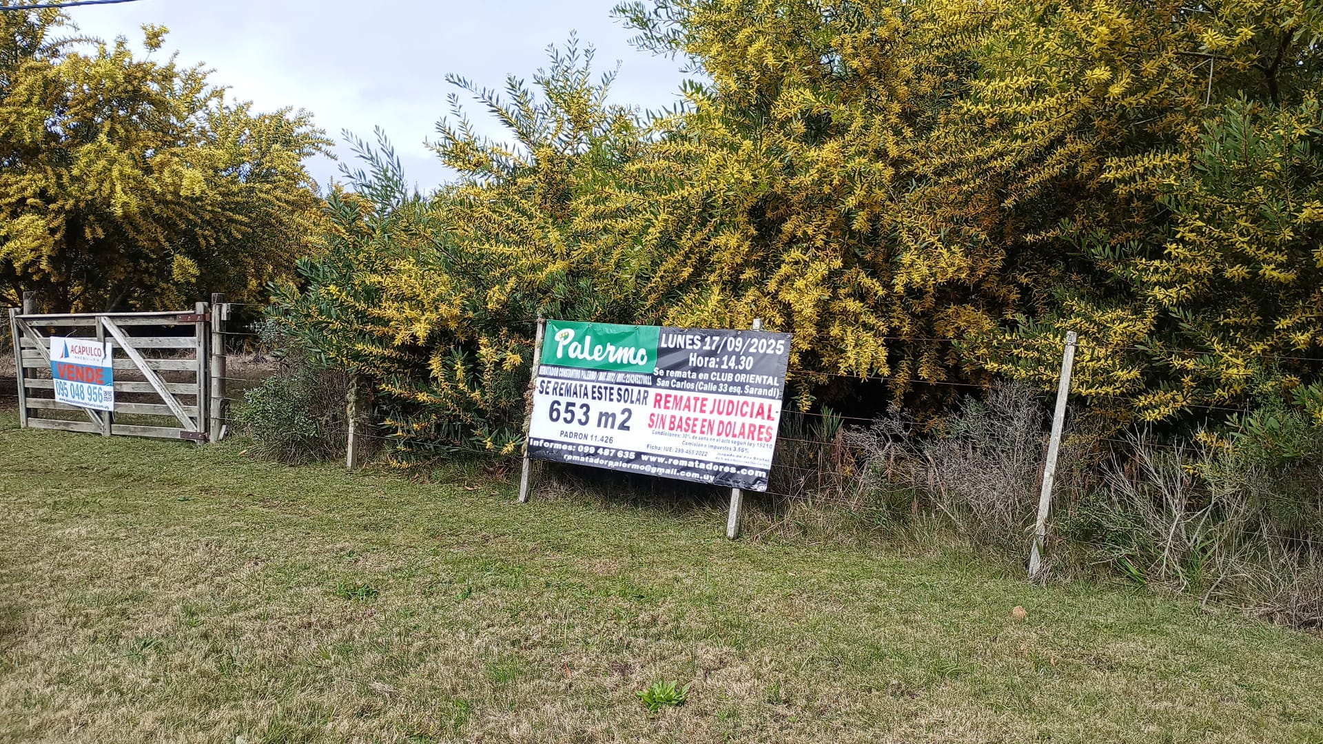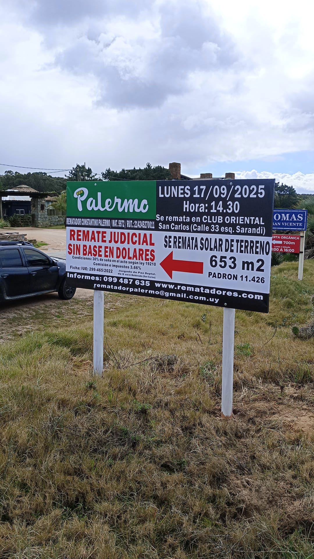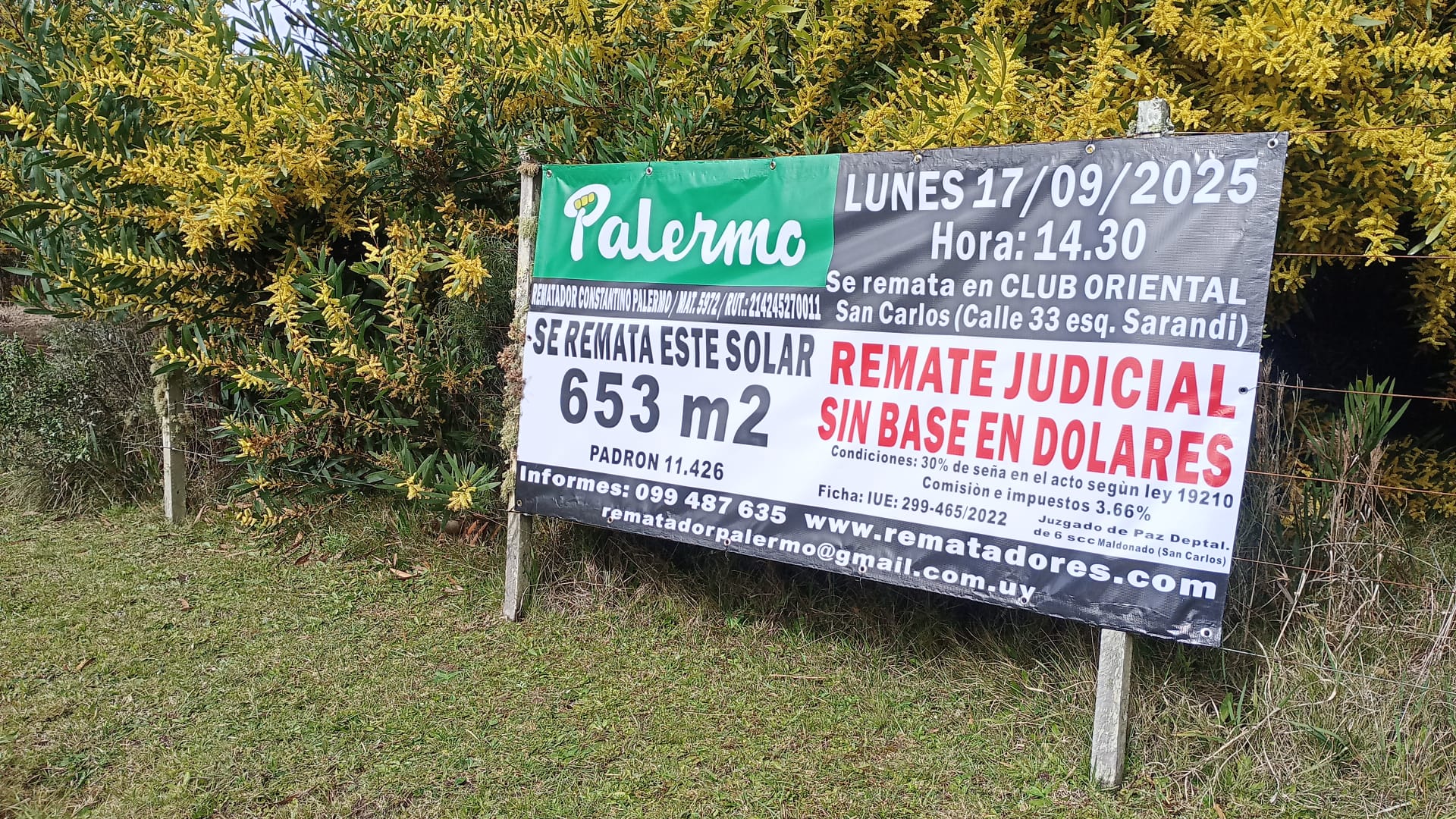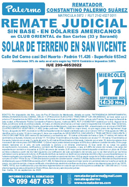 EDICTO: Por disposición del Sr/a. Juez de Paz 6ª Sección de Maldonado, dictada en autos: “INTENDENCIA DEPARTAMENTAL DEMALDONADOC/GUGLICIMINO, DELIA Y OTROJUICIO EJECUTIVO TRIBUTARIO” IUE 299-465/2022, se hace saber que el próximo 17 de setiembre de 2025 a partir de las 14:30 horas en el Club oriental de San Carlos , sito en calle Treinta y Tres esquina Sarandí de esta ciudad, el Rematador Publico Constantino Palermo Suarez, matricula 5972, RUT: 214245270011 asistido por la Sra. Alguacil de la Sede, pondrá a la venta en pública subasta , sin base, en dólares americanos y al mejor postor el siguiente bien inmueble: Solar de terreno, sito en la Localidad catastral San Vicente, departamento de Maldonado, manzana catastral 308 , empadronado con el número ONCE MIL CUATROCIENTOS VEINTISEIS (11.426) (antes padrones 1569 y 18930 en mayor área), el que según plano del Agrimensor Hugo Taroco, de agosto de 1957, inscripto en la Oficina Departamental de Catastro de Maldonado con el número 1931 el 19 de agosto de 1959, se identifica como el solar 16 de la manzana 6, tiene una superficie de SEISCIENTOS CINCUENTA Y TRES METROS CINCUENTA Y CINCO DECIMETROS (653 metros 55 decímetros) y se deslinda así : 15 metros al Noreste de frente a Calle 17 metros; 44 metros 45 centímetros al Sureste, lindando con el Solar 17; 15 metros 10 centímetros al Sureste, lindando con el solar 17; 15 metros 10 centímetros al Suroeste, lindando con el solar 2 y parte del solar 3 y 42 metros 69 centímetros al Noroeste, lindando con el solar 15; todos los solares de la manzana 6 del mismo plano.SE PREVIENE: 1) Que el mejor postor deberá consignar el 30% de su oferta en carácter de seña. Dicho pago deberá realizarse en el acto, de serle aceptada la postura y en dólares americanos. 2) Que serán de su cargo los gastos de escrituración, honorarios, certificados y comisión del Rematador e impuestos, o sea, el 3,66% del precio del remate, y de cargo del expediente por comisión e impuestos el 2,22% del precio del remate. 3) El mejor postor deberá depositar el saldo en un plazo de 20 días corridos contados a partir del día hábil siguiente a la notificación del auto aprobatorio del remate, que no se interrumpirá por las ferias judiciales ni por la semana de turismo. 4) El estudio del título se realizó con testimonios notariales del último título y sus antecedentes por no haberse agregado los originales. 5) Se desconoce el estado ocupacional del bien. 6) Que según surge de la Cédula catastral, el padrón no cumple con el Art 178 de la Ley 17.296 (Declaración jurada de caracterización urbana).7) Existe deuda ante la Intendencia Departamental de Maldonado que al 25/06/2024 asciende a $ 411.962. 8) Deberá tener presente el mejor postor el cual deberá abonar la seña y el saldo de precio, con letra de cambio, cheque certificado o transferencia electrónica de Bancos de plaza, atento a las disposiciones de le Ley 19210, 19478, 19732, sus modificaciones y sus decretos reglamentarios en caso de que el monto supere la cantidad de 1.000.000 de U.I. Y a los efectos legales se esta publicación en Diario Oficial, diario local y web del poder judicial. San Carlos, 04 de septiembre de 2025 – MARÍA NOELIA FERNÁNDEZ ALBÍN, Juez Paz Dptal. Int.
