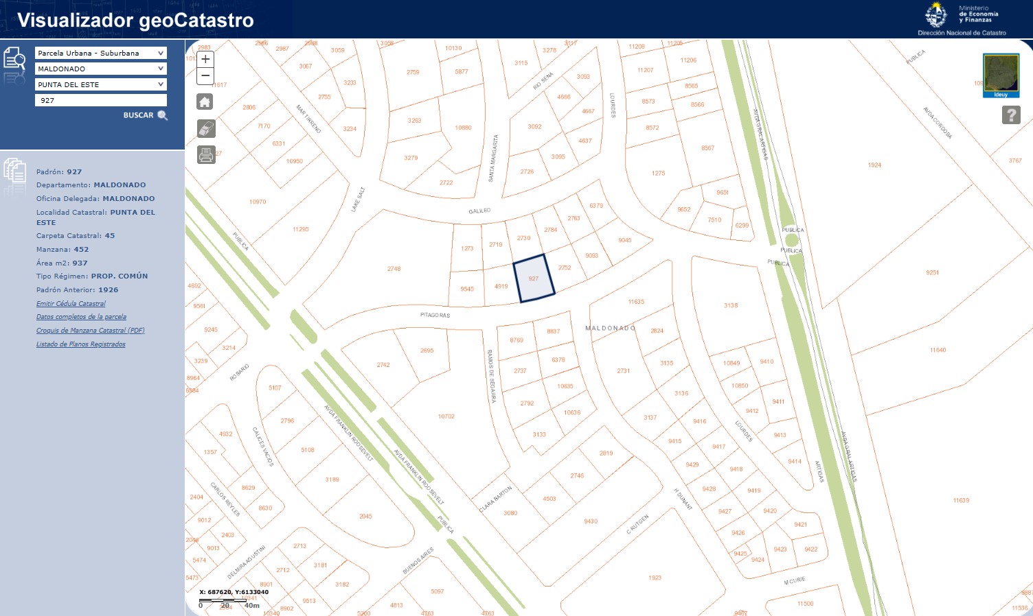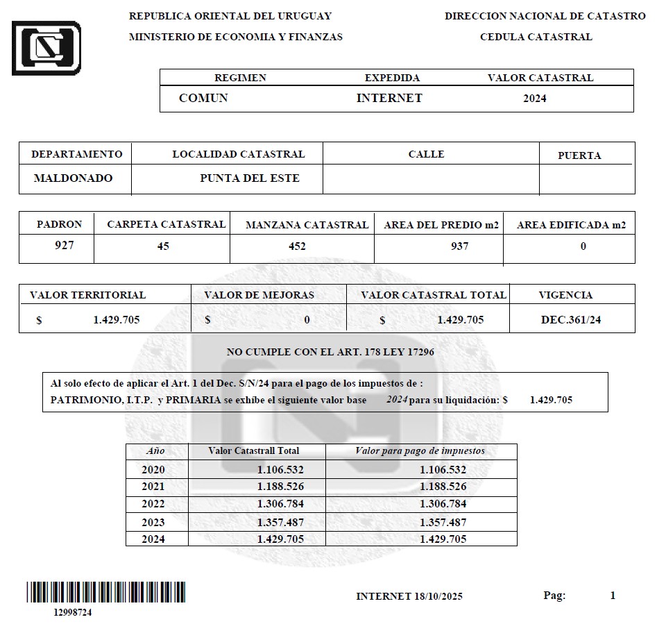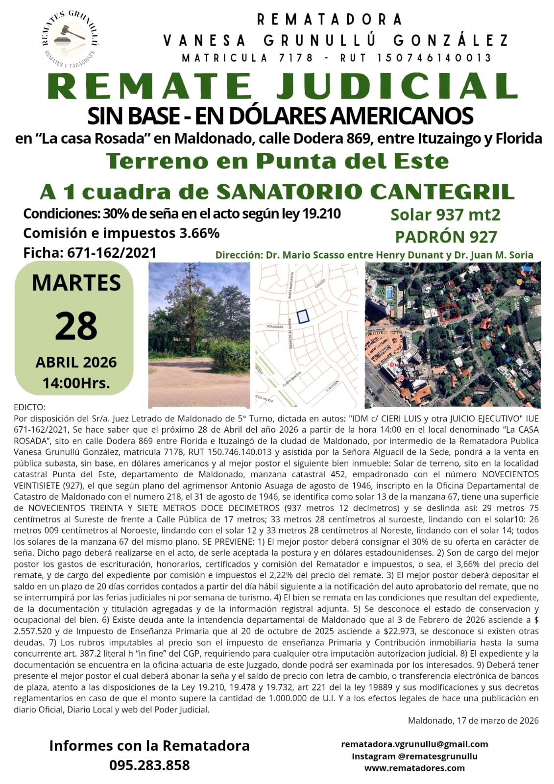 EDICTO: Por disposición del Sr/a. Juez Letrado de Maldonado de 5º Turno, dictada en autos: “IDM c/ CIERI LUIS y otra JUICIO EJECUTIVO” IUE 671-162/2021, Se hace saber que el próximo 28 de Abril del año 2026 a partir de la hora 14:00 en el local denominado “La CASA ROSADA”, sito en calle Dodera 869 entre Florida e Ituzaingó de la ciudad de Maldonado, por intermedio de la Rematadora Publica Vanesa Grunullú González, matricula 7178, RUT 150.746.140.013 y asistida por la Señora Alguacil de la Sede, pondrá a la venta en pública subasta, sin base, en dólares americanos y al mejor postor el siguiente bien inmueble: Solar de terreno, sito en la localidad catastral Punta del Este, departamento de Maldonado, manzana catastral 452, empadronado con el número NOVECIENTOS VEINTISIETE (927), el que según plano del agrimensor Antonio Asuaga de agosto de 1946, inscripto en la Oficina Departamental de Catastro de Maldonado con el número 218, el 31 de agosto de 1946, se identifica como solar 13 de la manzana 67, tiene una superficie de NOVECIENTOS TREINTA Y SIETE METROS DOCE DECIMETROS (937 metros 12 decímetros) y se deslinda así: 29 metros 75 centímetros al Sureste de frente a Calle Pública de 17 metros; 33 metros 28 centímetros al suroeste, lindando con el solar10: 26 metros 009 centímetros al Noroeste, lindando con el solar 12 y 33 metros 28 centímetros al Noreste, lindando con el solar 14; todos los solares de la manzana 67 del mismo plano. SE PREVIENE: 1) El mejor postor deberá consignar el 30% de su oferta en carácter de seña. Dicho pago deberá realizarse en el acto, de serle aceptada la postura y en dólares estadounidenses. 2) Son de cargo del mejor postor los gastos de escrituración, honorarios, certificados y comisión del Rematador e impuestos, o sea, el 3,66% del precio del remate, y de cargo del expediente por comisión e impuestos el 2,22% del precio del remate. 3) El mejor postor deberá depositar el saldo en un plazo de 20 días corridos contados a partir del día hábil siguiente a la notificación del auto aprobatorio del remate, que no se interrumpirá por las ferias judiciales ni por semana de turismo. 4) El bien se remata en las condiciones que resultan del expediente, de la documentación y titulación agregadas y de la información registral adjunta. 5) Se desconoce el estado de conservación y ocupacional del bien. 6) Existe deuda ante la intendencia departamental de Maldonado que al 3 de Febrero de 2026 asciende a $ 2.557.520 y de Impuesto de Enseñanza Primaria que al 20 de octubre de 2025 asciende a $22.973, se desconoce si existen otras deudas. 7) Los rubros imputables al precio son el impuesto de enseñanza Primaria y Contribución inmobiliaria hasta la suma concurrente art. 387.2 literal h “in fine” del CGP, requiriendo para cualquier otra imputación autorización judicial. 8) El expediente y la documentación se encuentra en la oficina actuaria de este Juzgado, donde podrá ser examinada por los interesados. 9) Deberá tener presente el mejor postor el cual deberá abonar la seña y el saldo de precio con letra de cambio, o transferencia electrónica de bancos de plaza, atento a las disposiciones de la Ley 19.210, 19.478 y 19.732, art 221 de la ley 19889 y sus modificaciones y sus decretos reglamentarios en caso de que el monto supere la cantidad de 1.000.000 de U.I. Y a los efectos legales de hace una publicación en diario Oficial, Diario Local y web del Poder Judicial. Maldonado, 17 de marzo de 2026. VERÓNICA LORENA FIAMENE PÉREZ, Administrativo III Colaboración Cargo: Actuario Adjunto.
