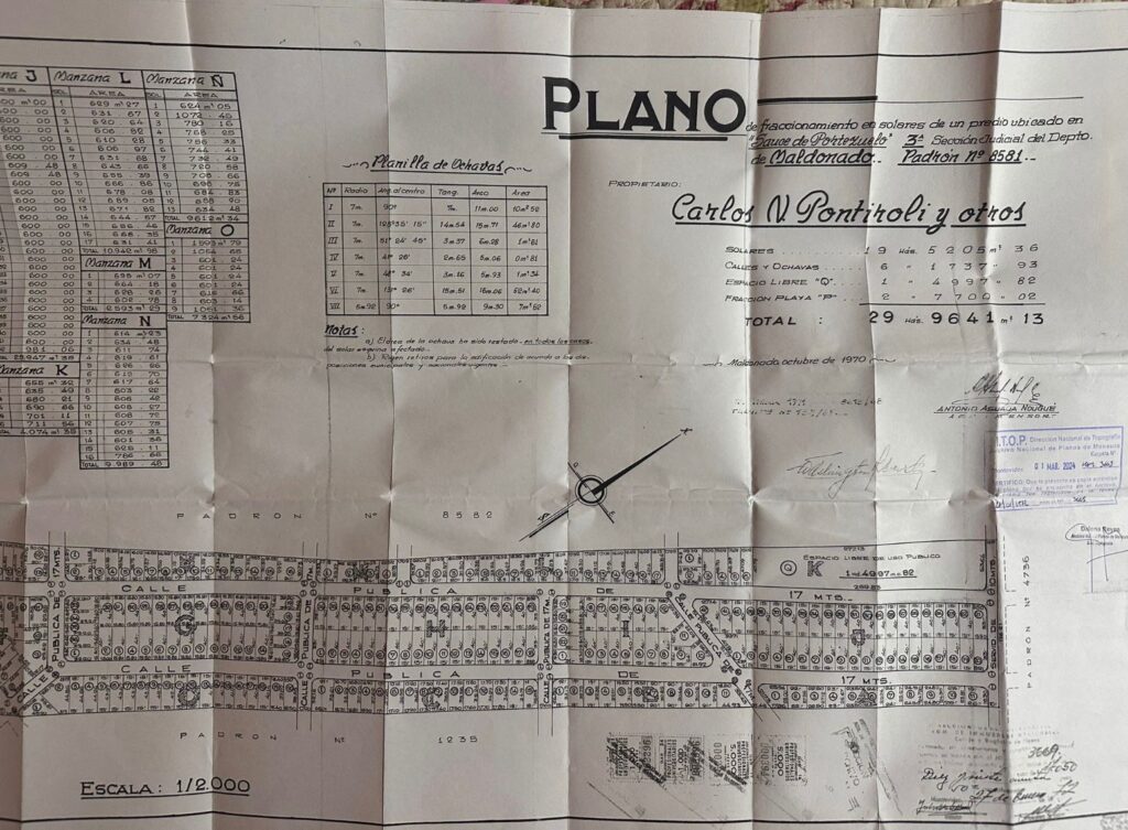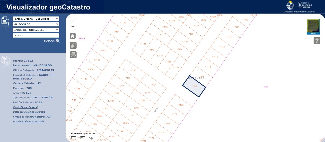 EDICTO: Por disposición del Sr/a. Juez de Paz 3ª Sección de Maldonado, dictada en autos: “INTENDENCIA DEPARTAMENTAL DE MALDONADO C/ MARTIN, EMILIANO SEBASTIAN Y OTRAVIA DE APREMIO” IUE 296-130/2020, se hace saber que el próximo 3 de setiembre de 2025 a partir de las 15:00 horas en puertas de este Juzgado , sito en calle Ituzaingo 568 de esta ciudad, el Rematador Publico Constantino Palermo Suarez, matricula 5972, RUT: 214245270011 asistido por la Sra. Alguacil de la Sede, pondrá a la venta en pública subasta , sin base, en pesos uruguayos y al mejor postor el siguiente bien inmueble: Solar de terreno , sito en la Localidad de Sauce de Portezuelo, departamento de Maldonado, manzana catastral 788,empadronado con el número DIECISIETE MIL CIENTO DOCE (17112) (antes padrón 8581 en mayor área) el que según plano de fraccionamiento del Agrimensor Antonio Asuaga Nogué , de octubre de 1970, inscripto en la Dirección General de Catastro con el número 3.669 el 27 de enero de enero de 1972, se identifica como solar 1 de la manzana B, tiene una superficie de SEISCIENTOS VEITIDOS METROS CUARENTAY SEIS DECIMETROS (622metros. 46 decímetros) y se deslinda así: 26,50 metros al Suroeste de frente a Calle Pública de 17 metros; 12 metros al Noroeste de frente a Calle Pública de 17 metros; 33,13 metros al Noreste lindando con el solar 2; y 19 metros al Sureste, lindando con el Padrón 1235.SE PREVIENE: 1) Que el mejor postor deberá consignar el 30% de su oferta en carácter de seña. Dicho pago deberá realizarse en el acto, de serle aceptada la postura. 2) Que serán de su cargo los gastos de escrituración, honorarios, certificados y comisión del Rematador e impuestos, o sea, el 3,66% del precio del remate, y de cargo del expediente por comisión e impuestos el 2,22% del precio del remate. 3) El mejor postor deberá depositar el saldo en un plazo de 20 días corridos contados a partir del día hábil siguiente a la notificación del auto aprobatorio del remate, que no se interrumpirá por las ferias judiciales ni por la semana de turismo. 4) El remate se efectúa en las condiciones que resultan del expediente, documentación, la titulación agregada y la información registral adjunta. 5) Se desconoce el estado ocupacional y de conservación del bien. 6) Existe deuda ante la Intendencia Departamental de Maldonado que al 3/01/2025 asciende a $ 284.763. 7)Los rubros imputables al precio del remate son el impuesto a la enseñanza primaria y la contribución inmobiliaria, hasta la suma concurrente, debiendo solicitar para cualquier otra imputación autorización judicial 8) Deberá tener presente el mejor postor el cual deberá abonar la seña y el saldo de precio, con letra de cambio, cheque certificado o transferencia electrónica de Bancos de plaza, atento a las disposiciones de le Ley 19210, 19478, 19732, sus modificaciones y sus decretos reglamentarios en caso de que el monto supere la cantidad de 1.000.000 de U.I. Y a los efectos legales se esta publicación en Diario Oficial, diario local y web del poder judicial. Dr. Juan Martin Dutra Bentancor Maldonado, 25 de julio de 2025. -JUAN MARTÍN DUTRA BENTANCOR, Juez de Paz Ciudad.