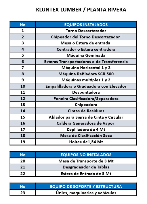 EDICTO: Por disposición de la Liga de Defensa Comercial (LIDECO), en su calidad de síndico de KLUNTEX S.A., en el marco del Concurso Necesario (I.U.E. 41.211/2025) y en cumplimiento de la medida decretada por el Juzgado Letrado de Primera Instancia de Concursos de 2° Turno, se hace saber que el próximo 29 de abril de 2026, a las 15:00 horas, en el salón de Casa de Remates Bavastro, sito en la calle Misiones 1365 de esta ciudad, por intermedio del Martillero Héctor Bavastro (Mat. 2237, RUT 213384600012) se procederá al remate público extrajudicial, en bloque y al mejor postor, de la Unidad Productiva de KLUNTEX S.A. Se subasta un aserradero operativo ubicado en las afueras de la ciudad de Rivera, Uruguay, con la base de dólares estadounidenses un millón ochocientos mil (U$S 1.800.000). La unidad cuenta con una capacidad instalada para producir mensualmente alrededor de 130 contenedores de 40′ de madera aserrada seca. La venta se realiza en bloque e incluye instalaciones completas, maquinaria de aserrío, caldera de secado, permisos operativos y Autorización Ambiental de Operación. Se exceptúan de la propiedad de los bienes: la caldera generadora de vapor nº 2, cámaras de secado Engecass y Mahild, y la red de incendio con su caseta y tanque. Se otorga al mejor postor el derecho de uso de los bienes excluidos anteriormente, condicionados a que la actividad continúe en el mismo inmueble. La venta comprende la transferencia de habilitaciones nacionales y municipales vinculadas al predio. Se informa la preexistencia de beneficios fiscales (COMAP) sujetos a análisis previo por parte del interesado. SE PREVIENE QUE: 1°) El potencial comprador adquirirá el derecho a constituir en cesionario del contrato de arrendamiento siempre y cuando se acuerde las garantías con los propietarios del predio. Los propietarios del bien, se comprometen a arrendar por al menos 20 años, siempre y cuando se ofrezcan las garantías suficientes. 2°) Serán de cargo del Comprador los gastos vinculados a la adquisición, honorarios, certificados, y la Comisión del Rematador e Iva, o sea el 14,64% del precio de remate. 3°) El mejor postor deberá consignar en el acto del remate el 30% de la oferta, disponiendo de un plazo de 30 días para el pago del saldo y la toma de posesión de la planta. 4º) Correrá por cuenta del juzgado el levantamiento de las garantías prendarias existentes, dejando constancia que no se podrá disponer del precio por parte de la sindicatura hasta que se haya otorgado el levantamiento correspondiente. 5º) Es de aplicación el art. 177 de la ley 18.387, que establece que: no serán de cargo del mejor postor las deudas comerciales, laborales, municipales, tributarias o de cualquier otra naturaleza que recaigan sobre el bien a subastar. 6º) La compraventa de los bienes muebles será otorgada por el Síndico Liga de Defensa Comercial. 7º) Que la posesión de los bienes se confiere simultáneamente con el pago de la totalidad de la oferta. 8º) El expediente se encuentra a disposición de los interesados en el Juzgado Letrado de Concursos de 2° Turno. 9º) ESTADO DE LOS BIENES.- Que los bienes se rematan en el actual estado de conservación “a la vista y sin reclamo de ninguna naturaleza”.