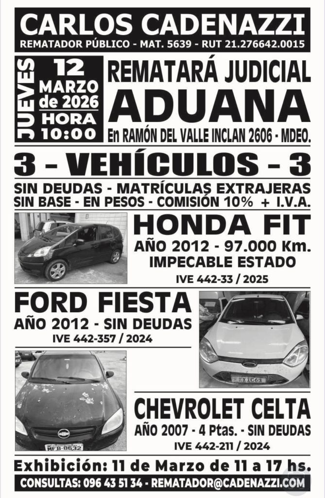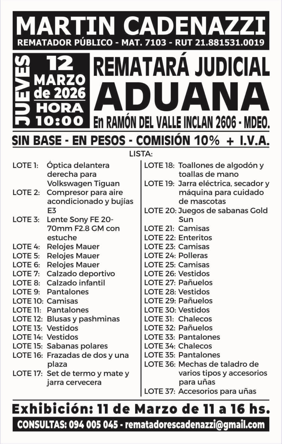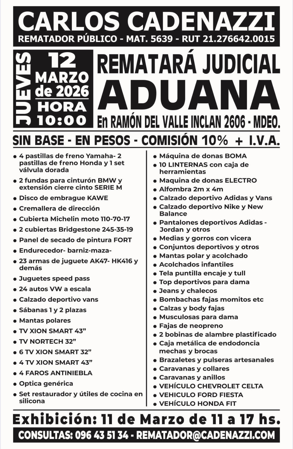 Carlos Cadenazzi Rematará judicial de ADUANA; 12 DE MARZO desde la hora